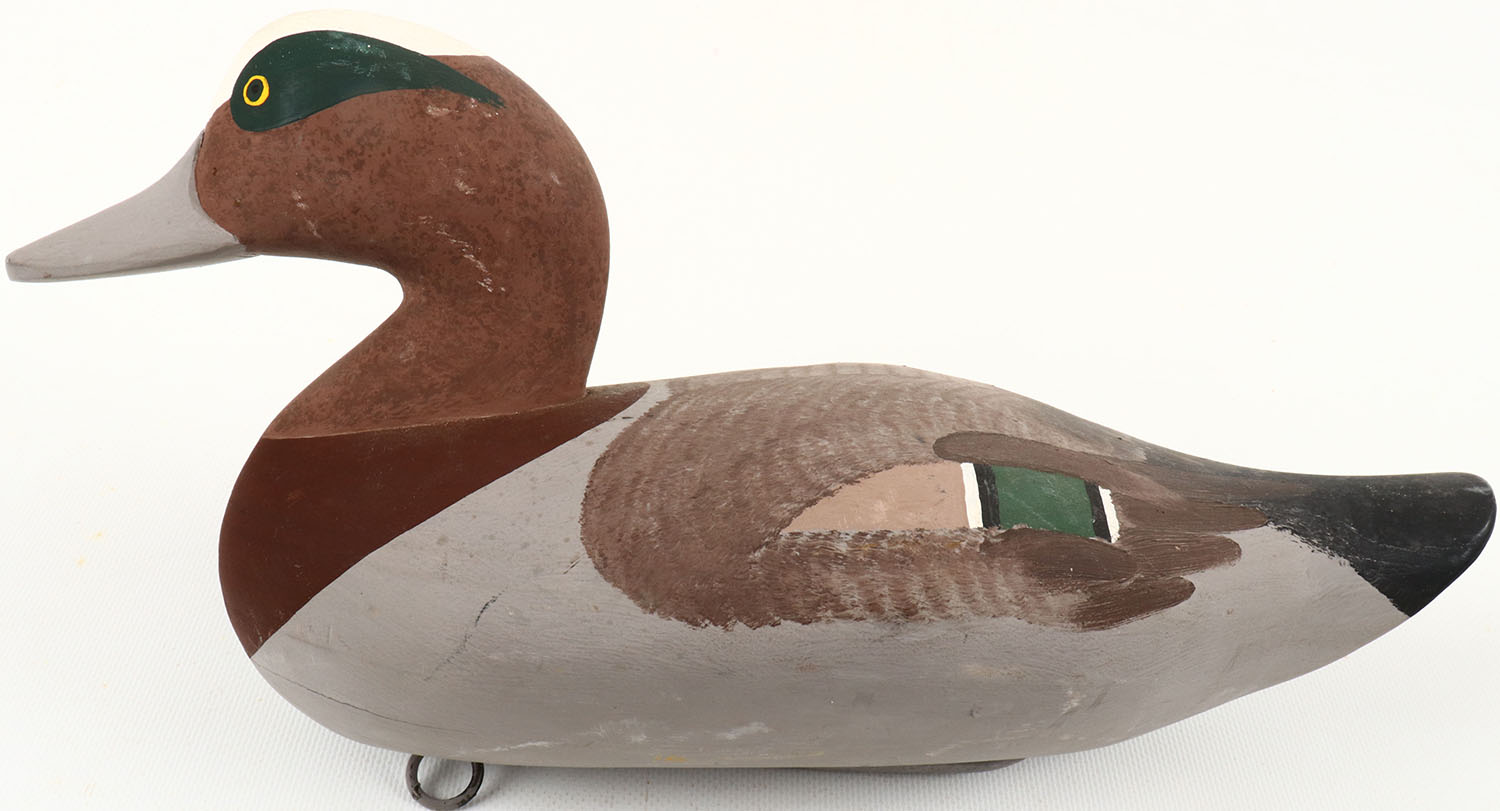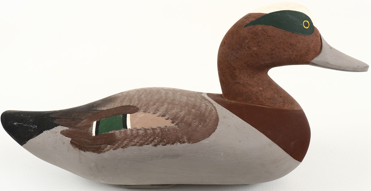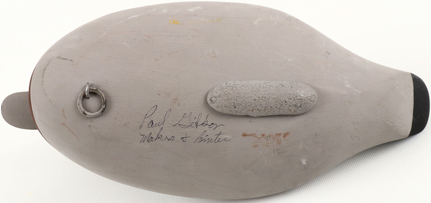 Widgeon Drake by Paul Gibson, Havre de Grace, MD, solid wood, painted eyes, excellent original paint, structurally excellent, bottom is signed. Grade: MINT - Value: 40 to 150