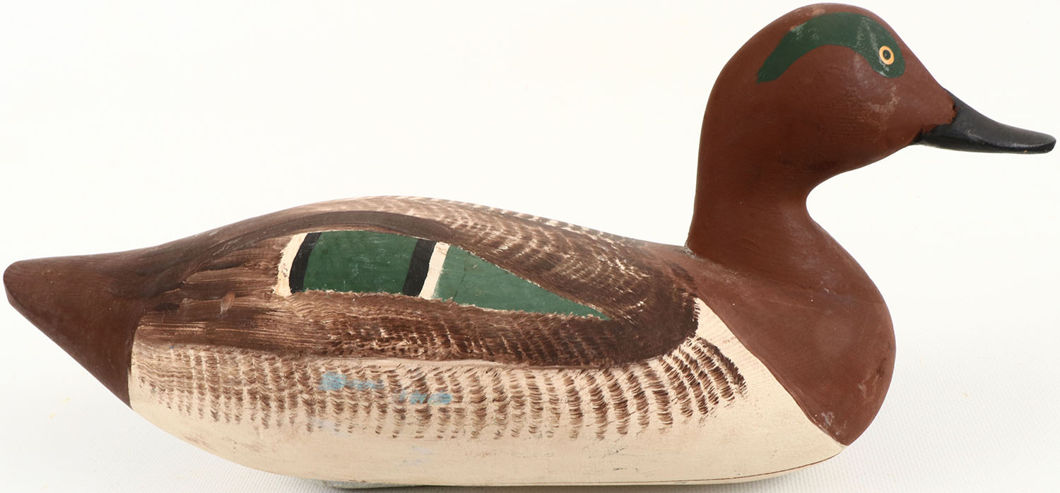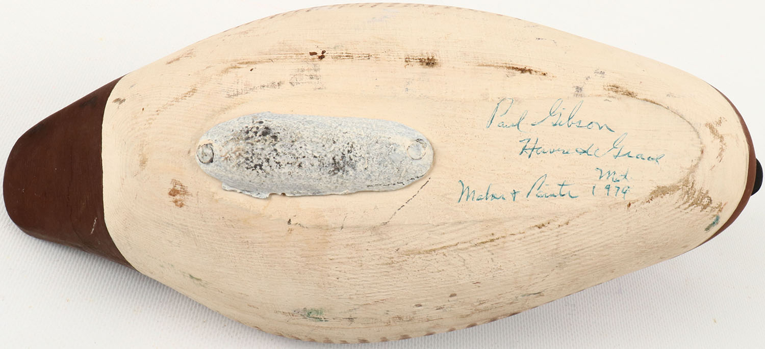 Green Wing Teal Drake by Paul Gibson, Havre de Grace, MD, painted eyes, structurally excellent, solid wood, excellent original paint, bottom is signed. Grade: Excellent ++ - Value: 40 to 150