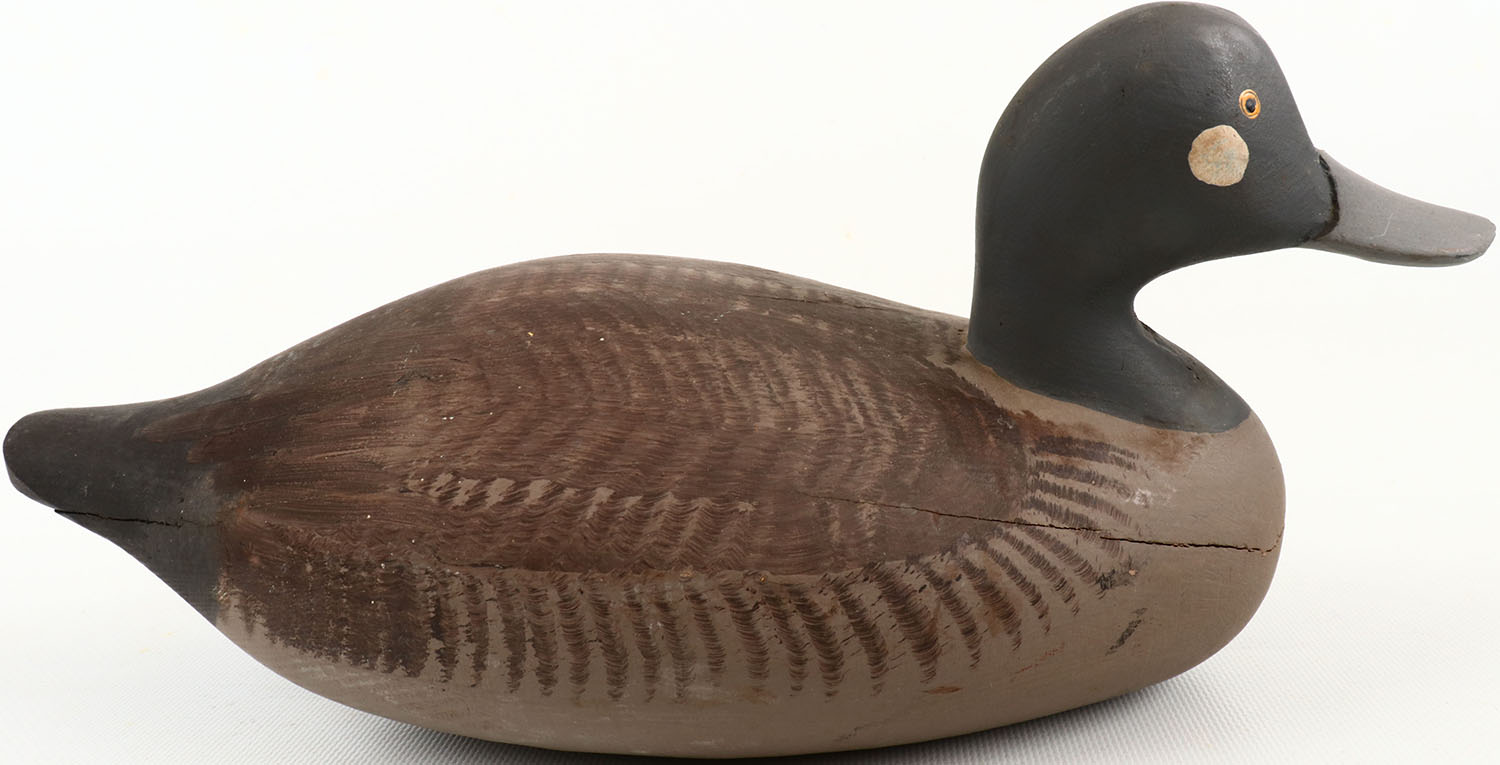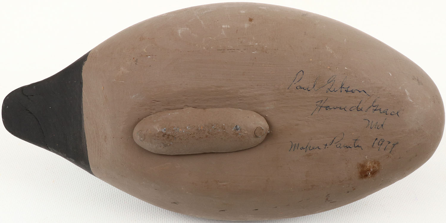Goldeneye Hen by Paul Gibson, Havre de Grace, MD, painted eyes, structurally excellent, solid wood, excellent original paint, has two hairline age cracks, signed on bottom. Grade: Excellent ++ - Value: 40 to 150