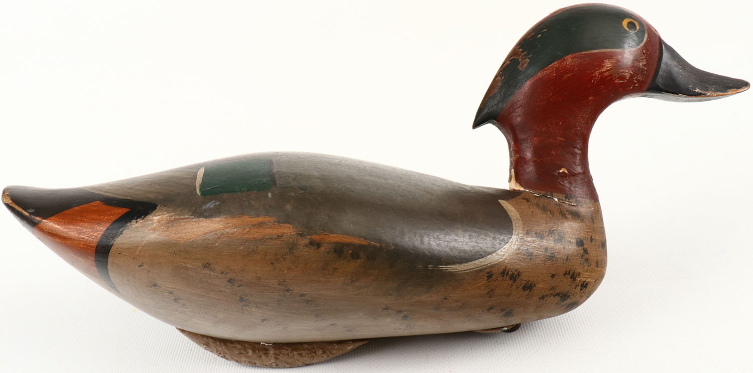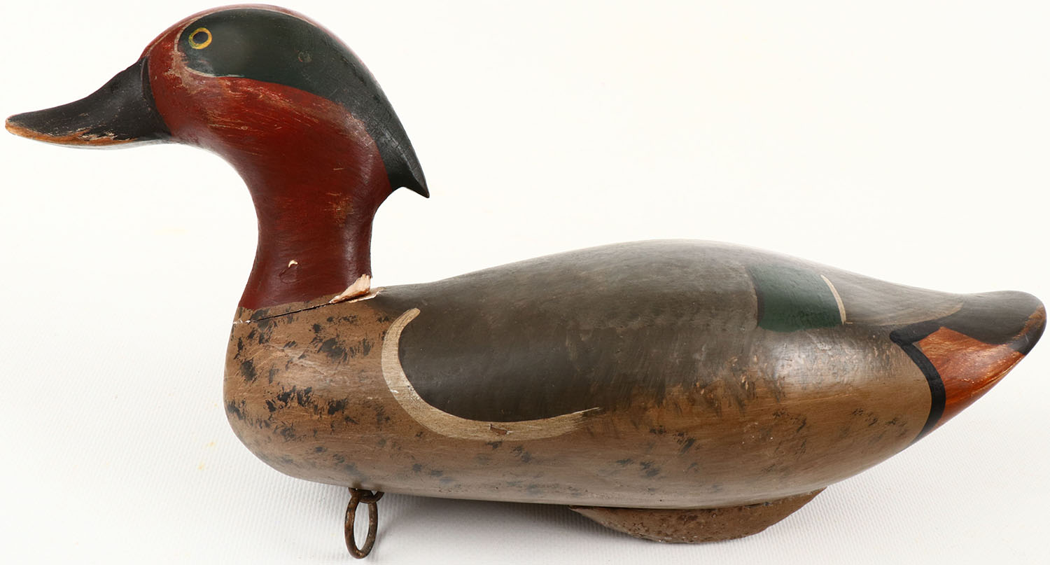 Green-wing Teal Drake by unknown maker, painted eyes, structurally excellent, has hairline crack to neck, solid wood, excellent original paint. Grade: Excellent - Value: 40 to 150