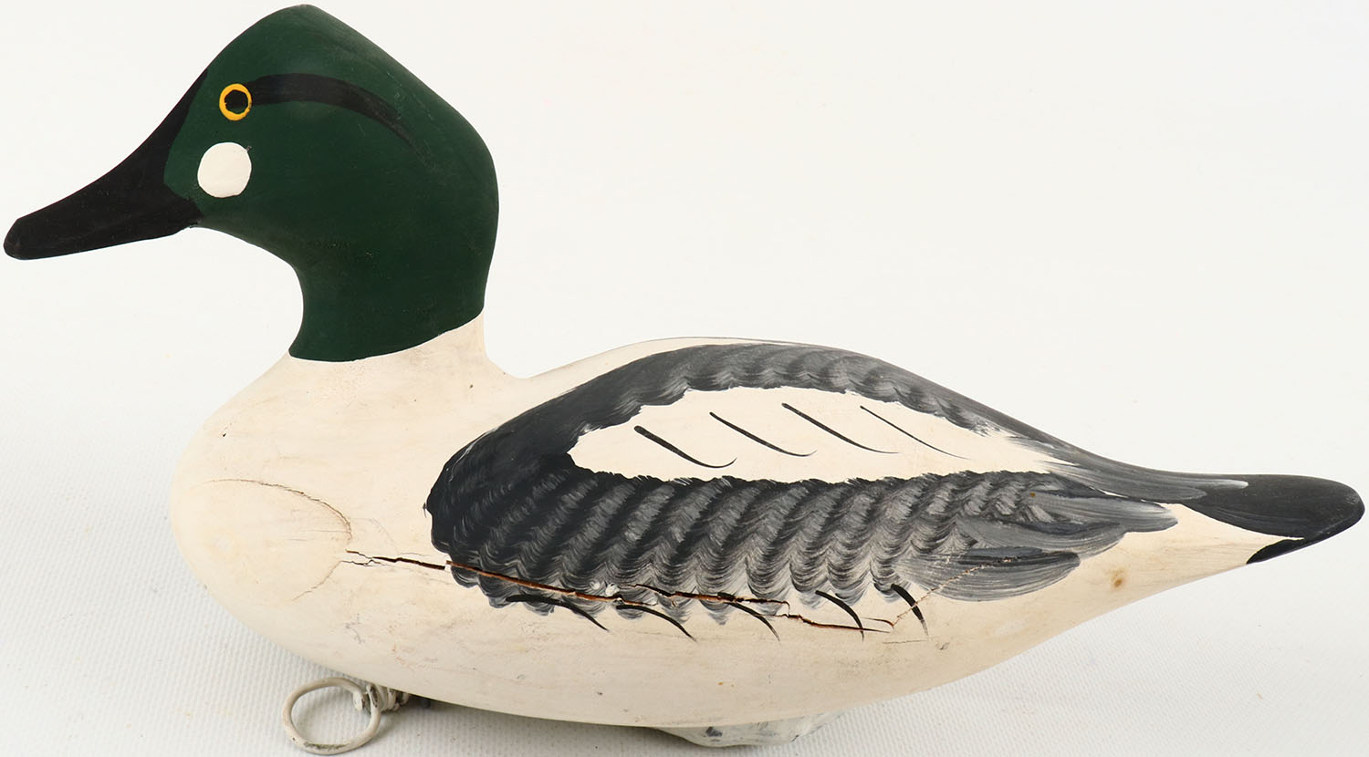 Goldeneye drake by Capt. Harry R. Jobes, Havre de Grace, MD, solid wood, painted eyes, mint original paint, has hair line crack to left side of body, bottom is signed. Grade: Excellent - Value: 40 to 150
