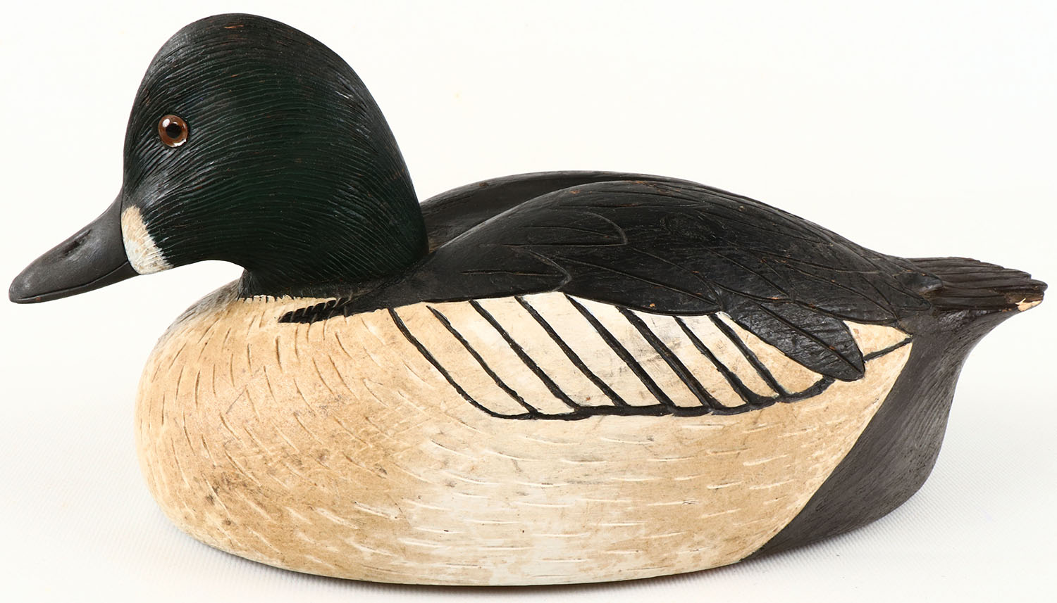 Goldeneye Drake by unknown maker, glass eyes, structurally excellent, solid wood, excellent original paint, has branded JC and TTO on bottom. Grade: Excellent - Value: 40 to 150