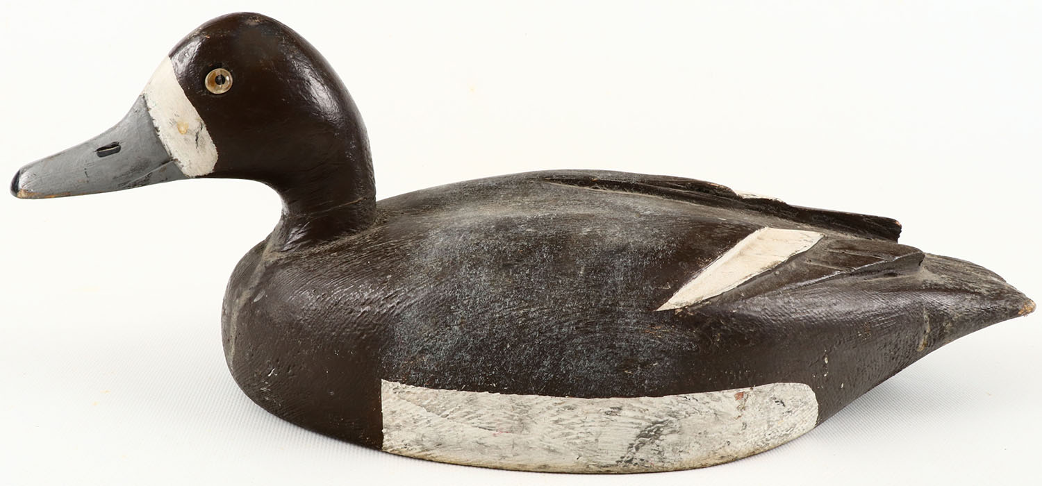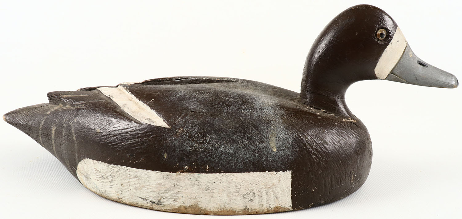 Bluebill Hen by L REETE?, CAN, glass eyes, structurally excellent, solid wood, neck has age crack, excellent original paint with typical wear. Grade: Very Good ++ - Value: 50 to 150