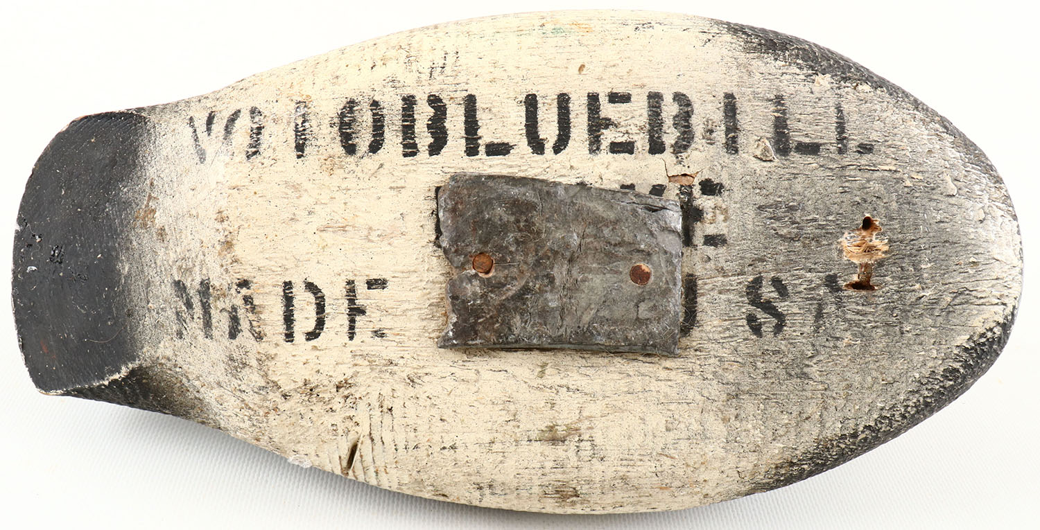 Bluebill Drake by unknown maker, glass eyes, structurally excellent, solid wood, neck filler shows crack, original paint with typical wear, Interesting Stamping on the bottom NO 10 BLUEBILL DECOY MADE IN USA. Grade: Very Good ++ - Value: 40 to 150
