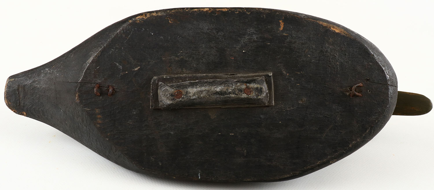 Black Duck by unknown maker, glass eyes, structurally excellent, solid wood, excellent original paint, branded W F CLARK, SMITHTOWN, L.I., New York. Grade: Excellent - Value: 100 to 200