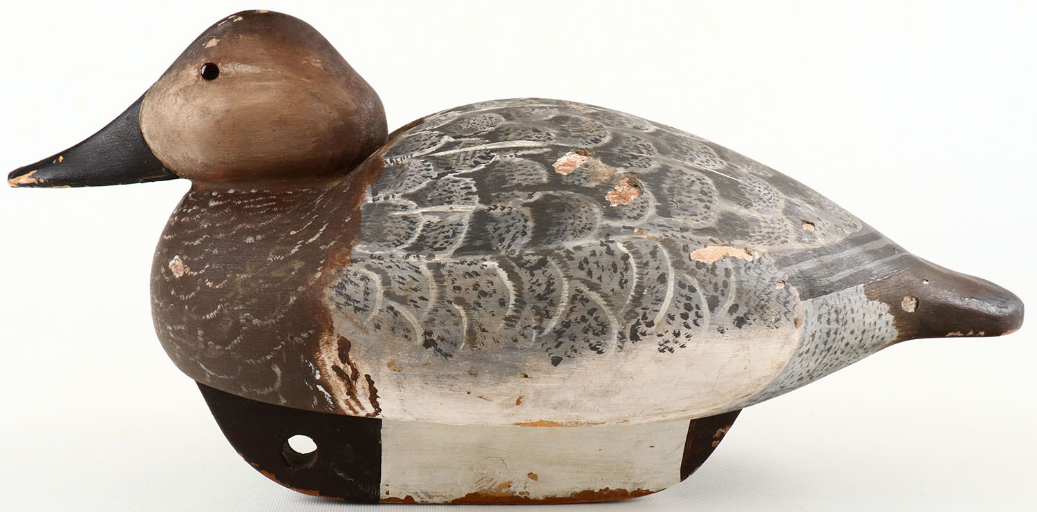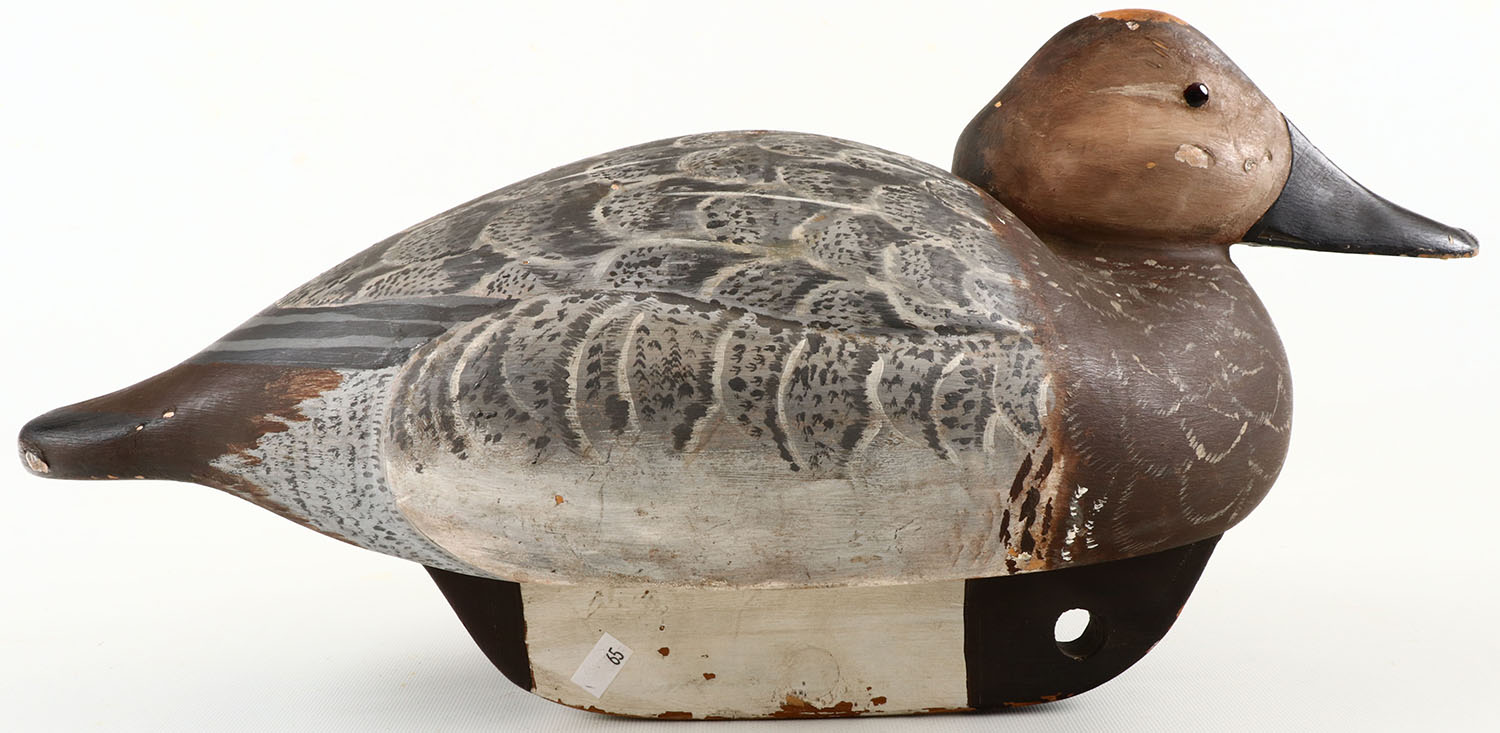 Canvasback Hen by unknown maker, glass eyes, structurally excellent, solid wood, original paint shows some wear. Grade: Very Good ++ - Value: 40 to 150