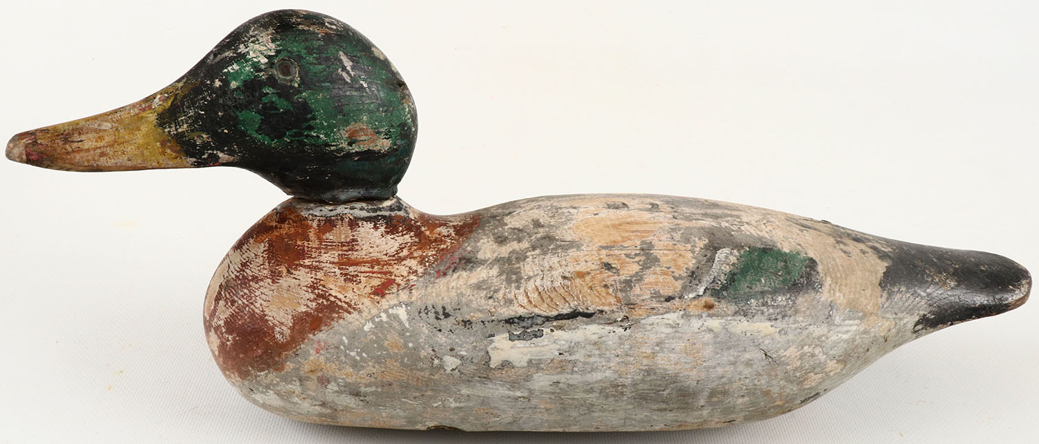 Mallard Drake by Mason Decoy Company., 1896-1924 standard grade, tack eyes, structurally excellent, solid wood, head is loose, repainted. Grade: Very Good - Value: 20 to 100