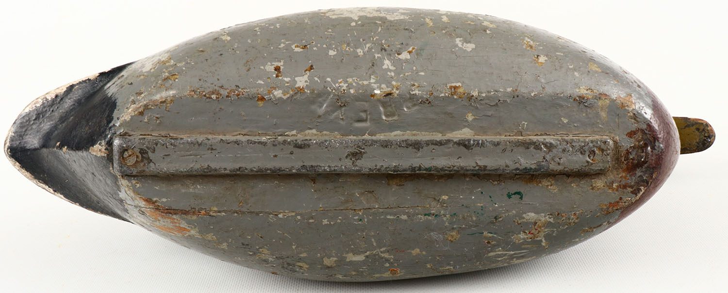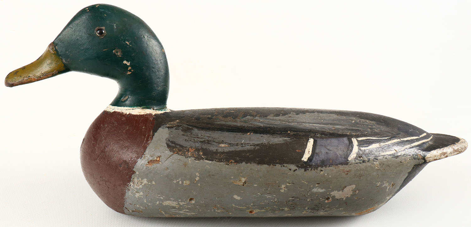 Mallard Drake by unknown maker, Illinois River, IL, glass eyes, structurally excellent, solid wood, excellent original paint with typical wear, has PREXN branded on bottom. Grade: Very Good ++ - Value: 20 to 100