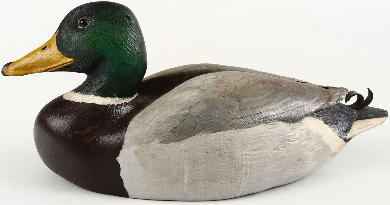 Mallard Drake by E. Bennett, glass eyes, structurally excellent, solid wood, excellent original paint, shows feather detail. Grade: MINT - Value: 20 to 100
