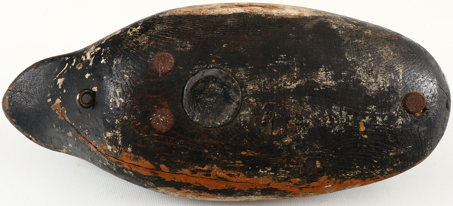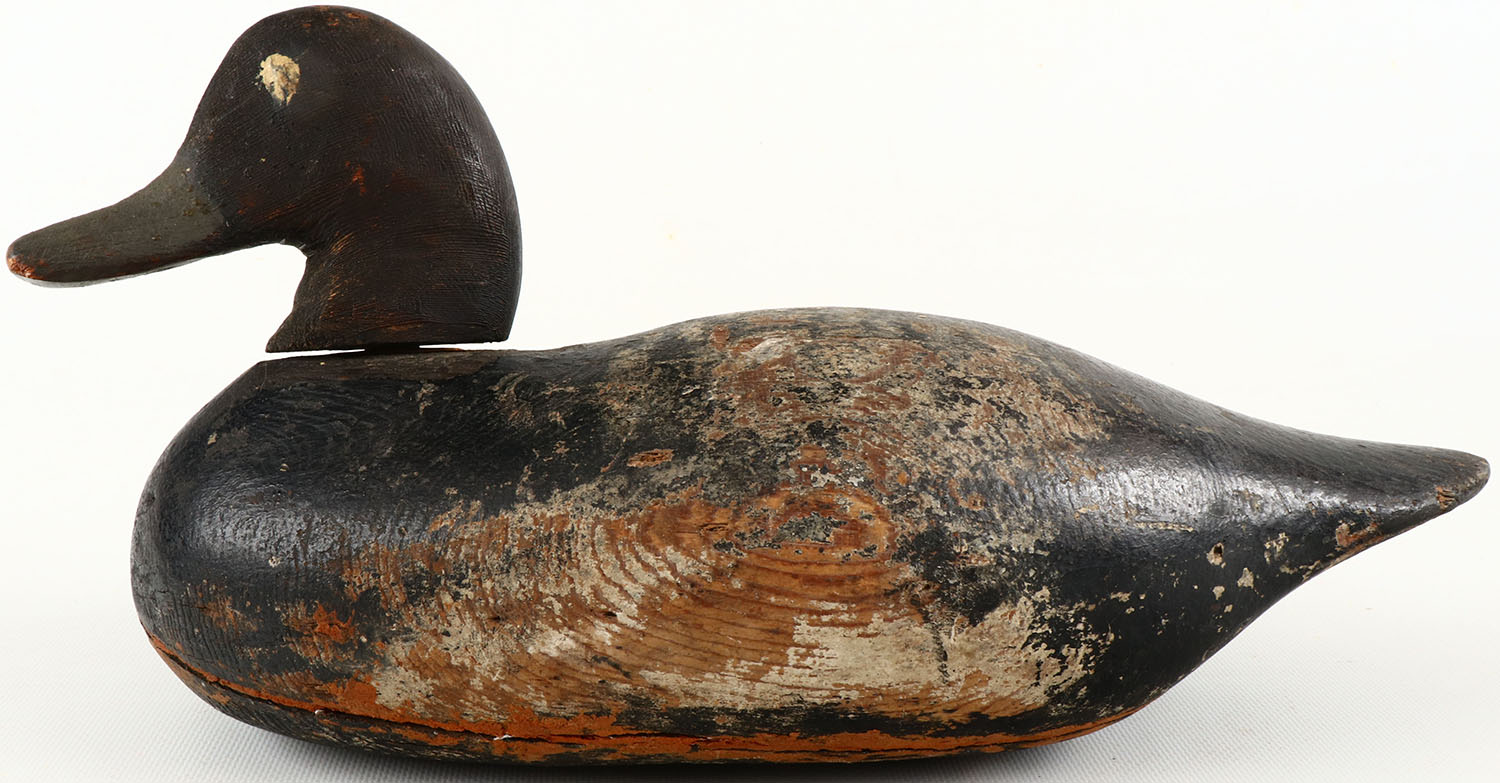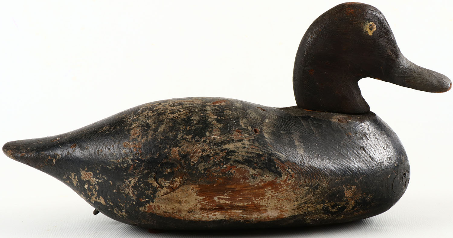 Bluebill Drake by unknown maker, painted eyes, structurally excellent, solid wood, neck is loose, has filled age cracks, paint shows loss. Grade: Very Good - Value: 20 to 100