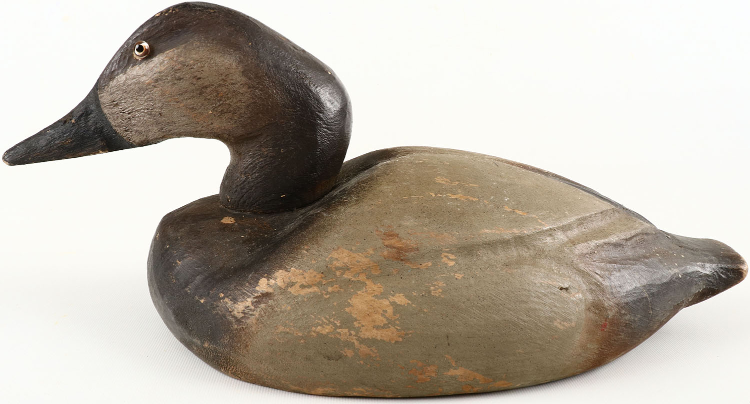 Canvasback Hen by Animal Trap Company, Pascagoula, MS, glass eyes, structurally excellent, solid wood, neck is loose, excellent original paint with typical wear, stamped on bottom. Grade: Excellent - Value: 40 to 150