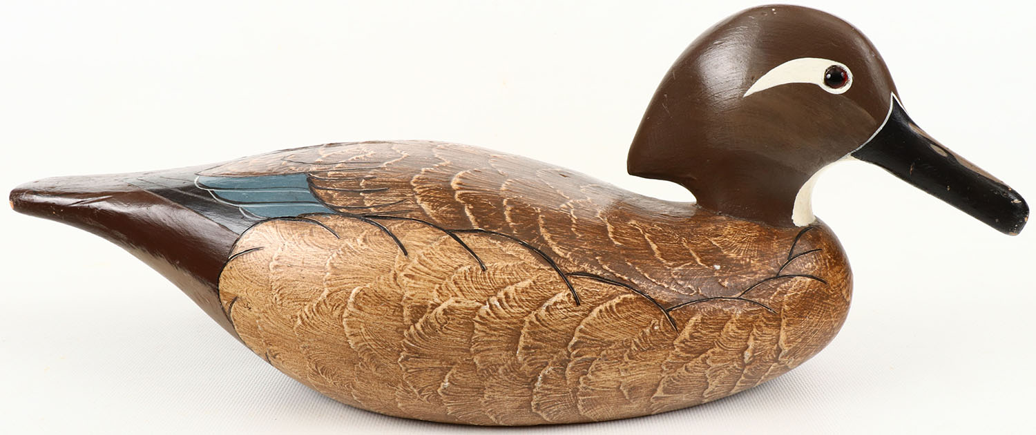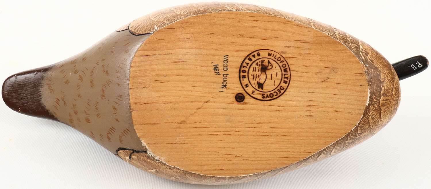 Woodduck Hen by Wildfowler Decoys, Babylon, N.Y. glass eyes, structurally excellent, solid wood, mint original paint. Grade: MINT - Value: 40 to 150
