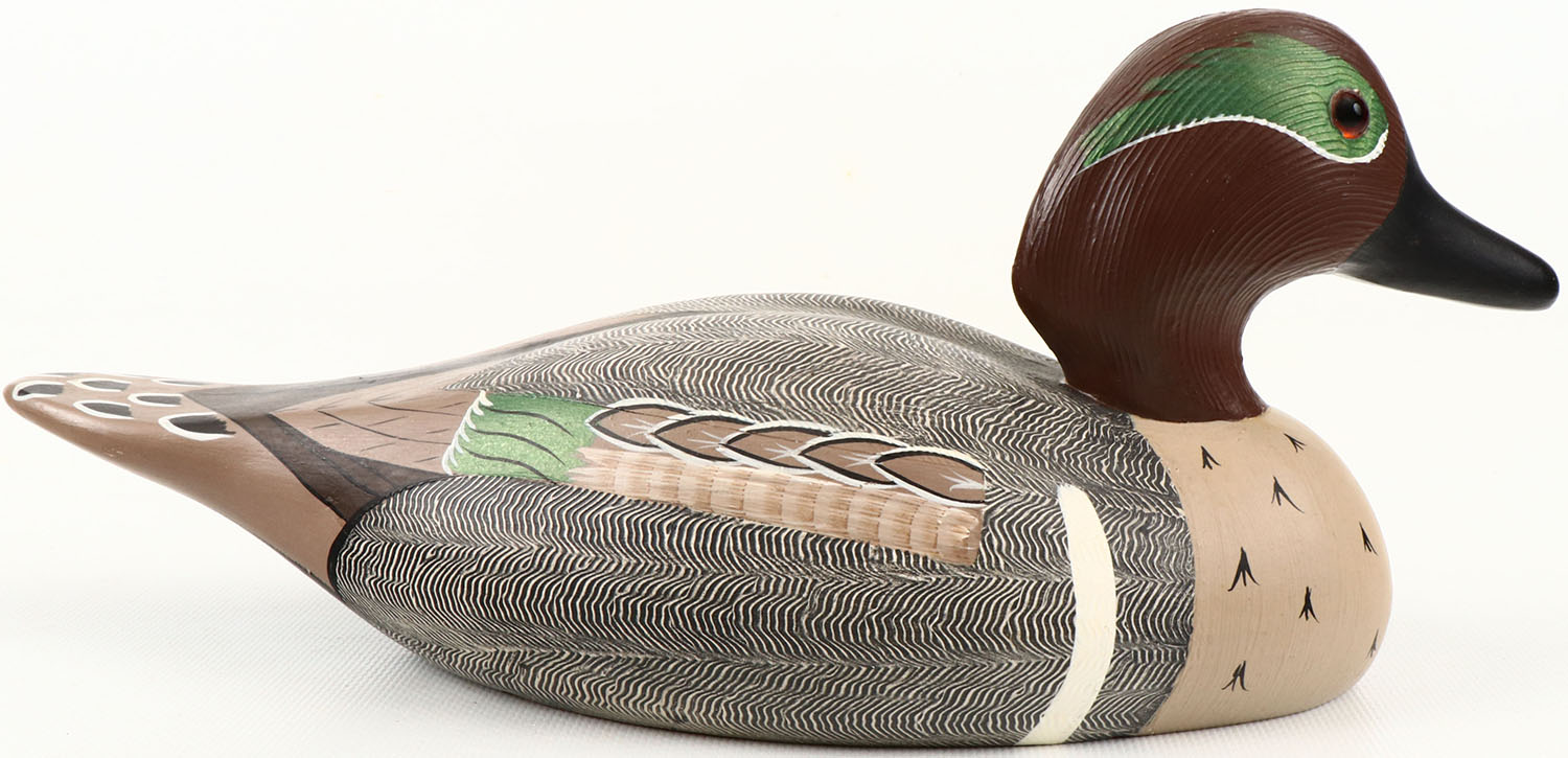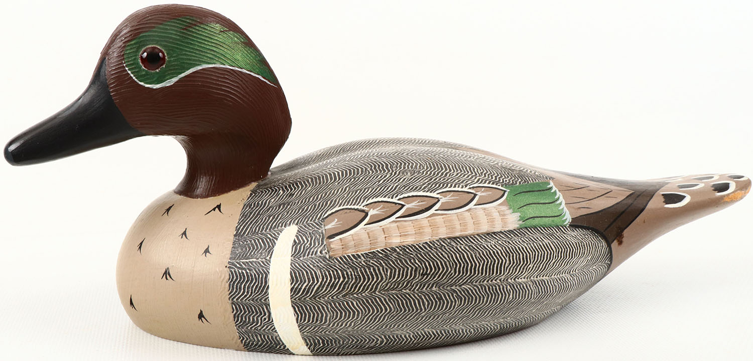 Green Wing Teal Drake by Wildfowler Decoys, Babylon, N.Y. glass eyes, structurally excellent, solid wood, mint original paint, excellent original comb painting. Grade: MINT - Value: 40 to 150