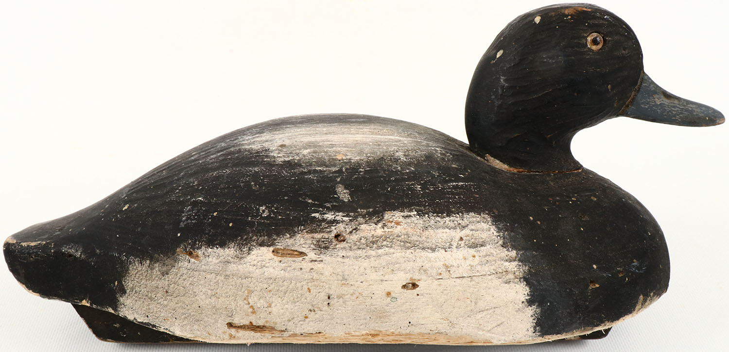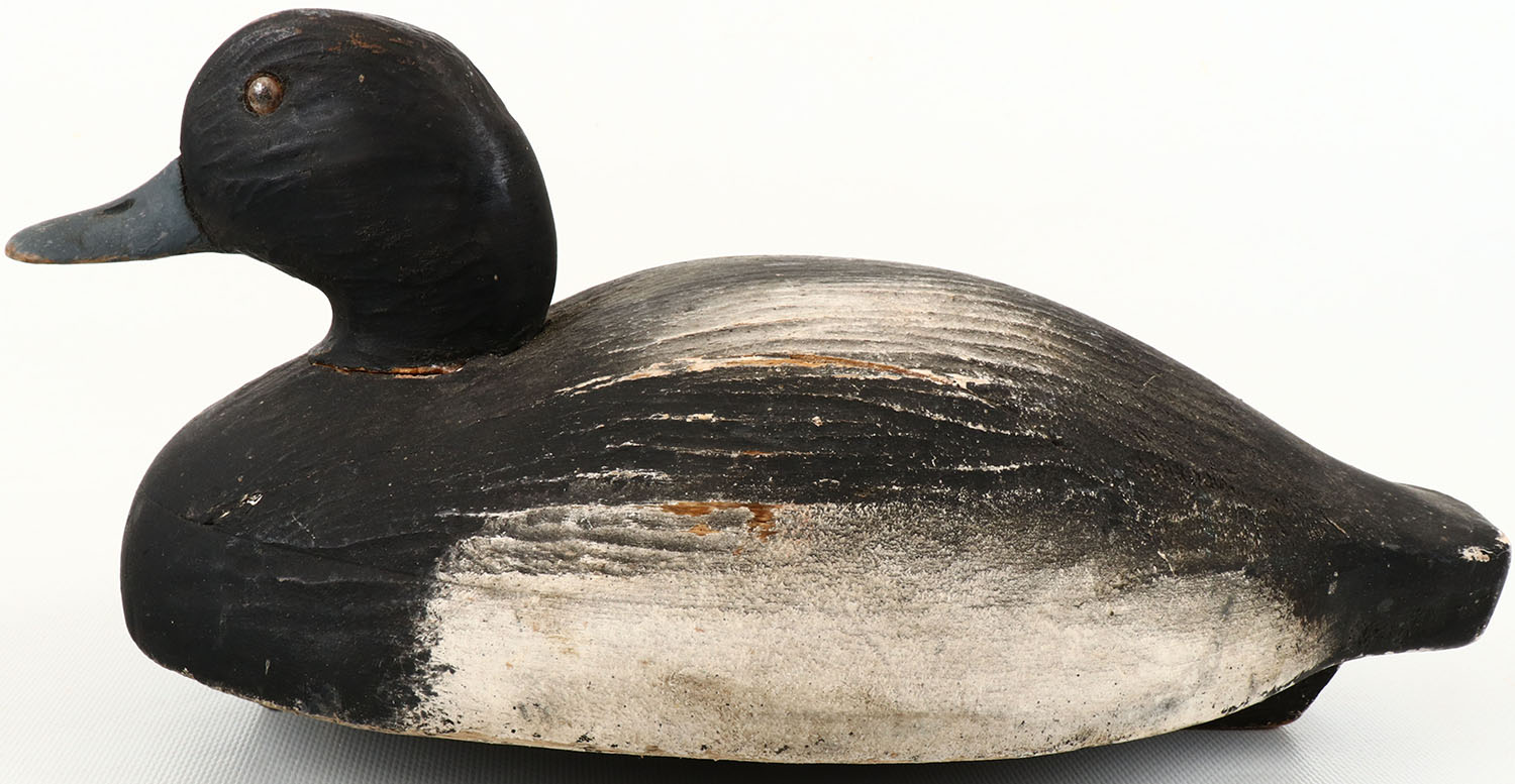 Bluebill Drake by Wildfowler Decoys, Saybrook CT, glass eyes, structurally excellent, solid balsa wood, excellent original paint. Grade: Very Good ++ - Value: 40 to 150