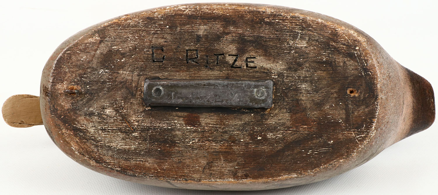 Shoveler Hen by C. Ritze, glass eyes, structurally excellent, solid wood, excellent original paint with feathered detail, has branded C RITZE on bottom. Grade: Excellent - Value: 20 to 60