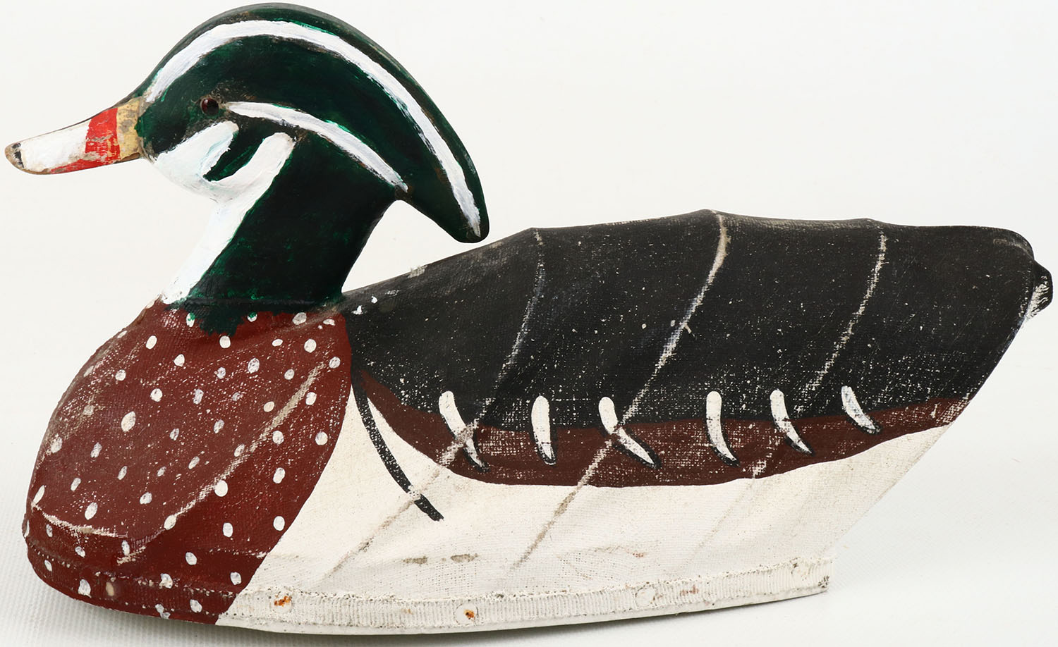 Woodduck Drake by unknown maker, NC, glass eyes, wood head, canvas over wire body, excellent original paint, branded W.M. on bottom. Grade: Excellent - Value: 20 to 40