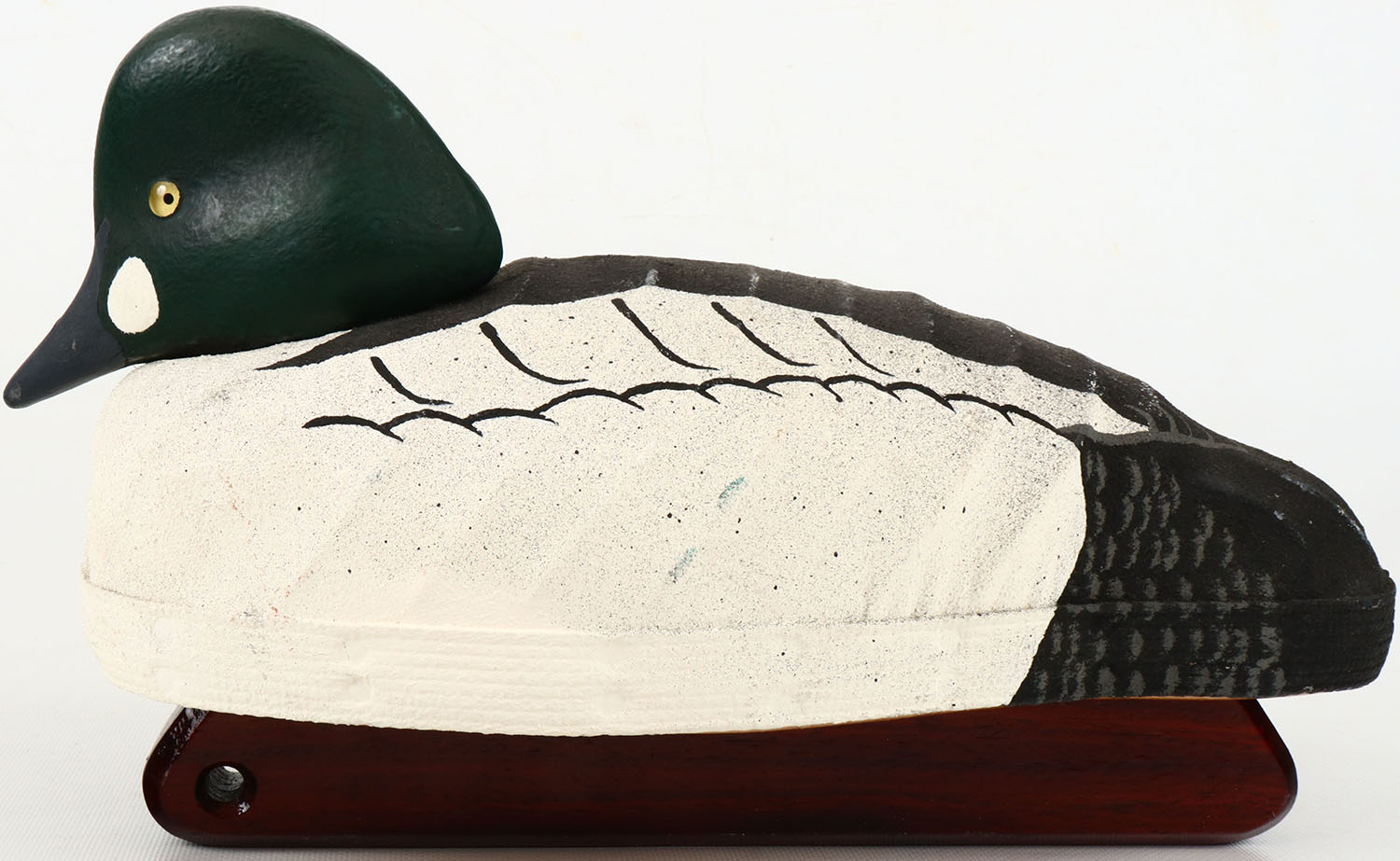 Goldeneye Drake by C.J., glass eyes, structurally excellent, wood head, canvas over wire body, excellent original paint, branded CJ on bottom. Grade: MINT - Value: 20 to 60