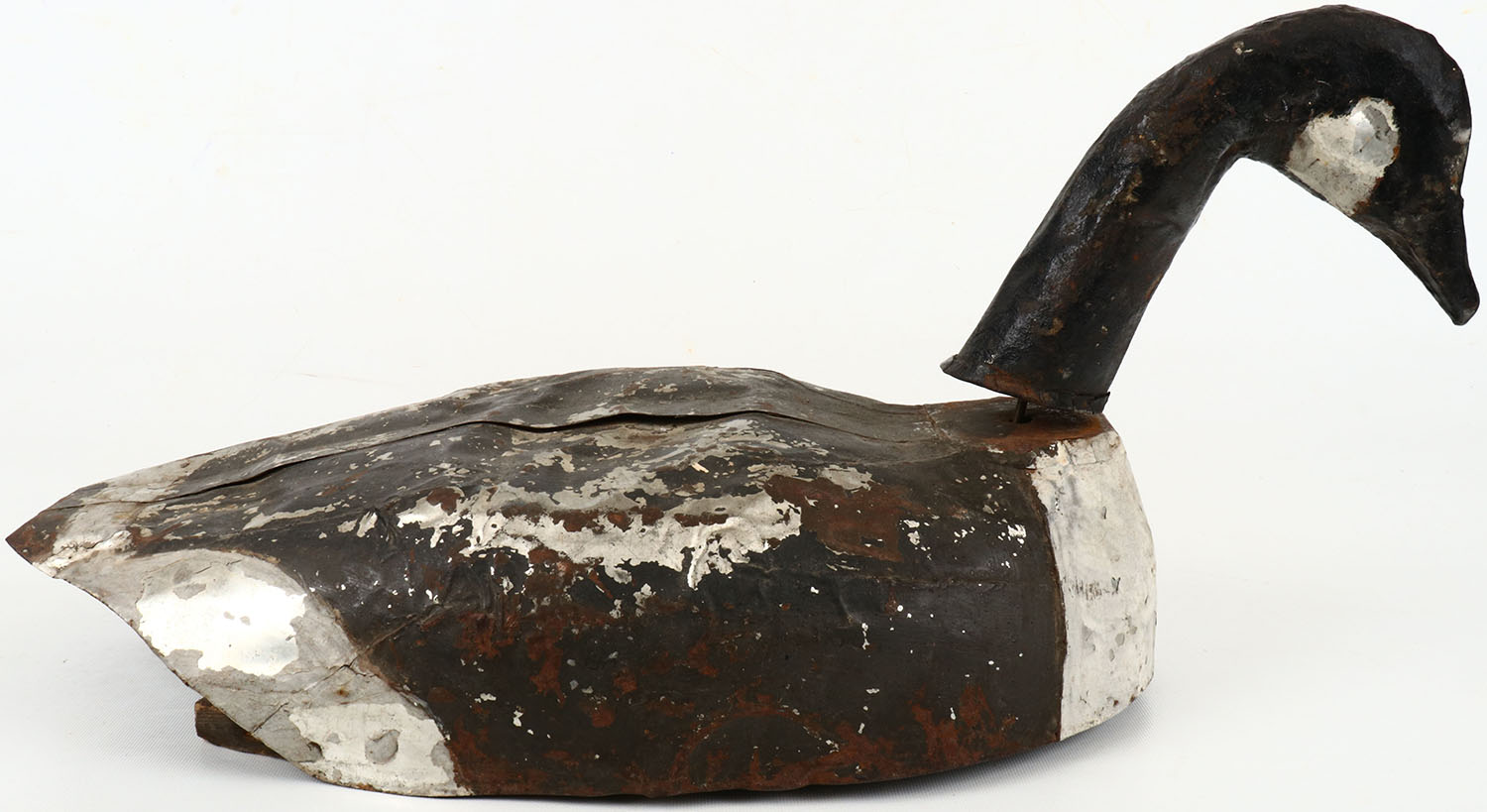 Canada Goose by unknown maker, no eyes, metal body, wood base, base is not attached to body and head is loose, original paint with lots of wear. Grade: Very Good ++ - Value: 20 to 60