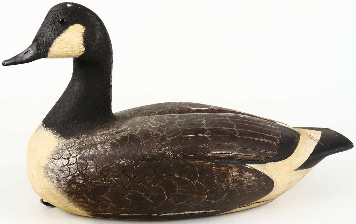 Canada Goose by unknown maker, glass eyes, hollow wood, original paint with comb painting, has hairline age crack at the front of the neck, branded J on bottom. Grade: Very Good ++ - Value: 50 to 100
