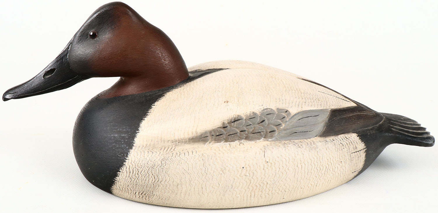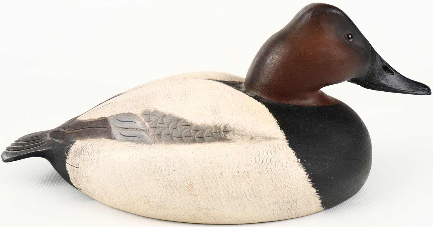 Canvasback Drake by ALS, glass eyes, structurally excellent, hollow wood, excellent original paint with excellent original comb painting, signed on bottom, branded ALS on bottom. Grade: Excellent - Value: 50 to 150