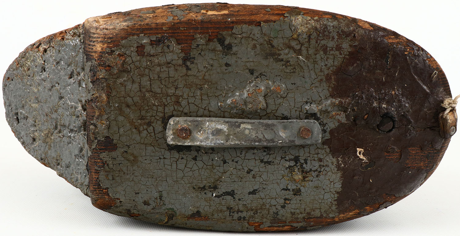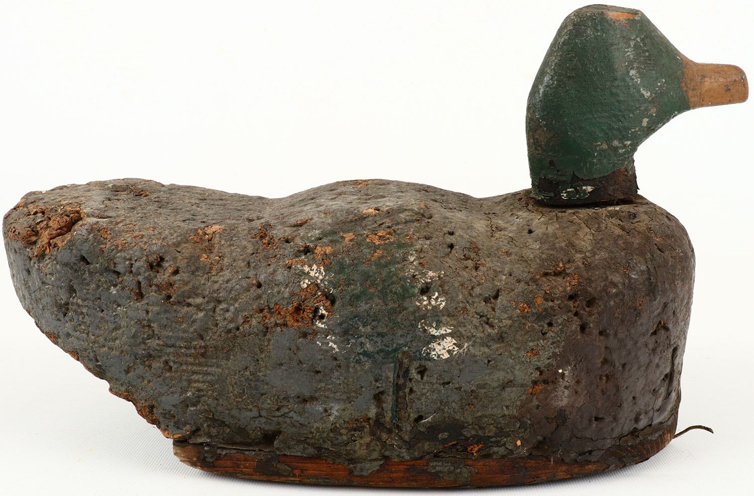 Mallard Drake by Oscar Quam?, no eyes, solid cork body, original paint shows wear. Grade: Very Good + - Value: 30 to 60