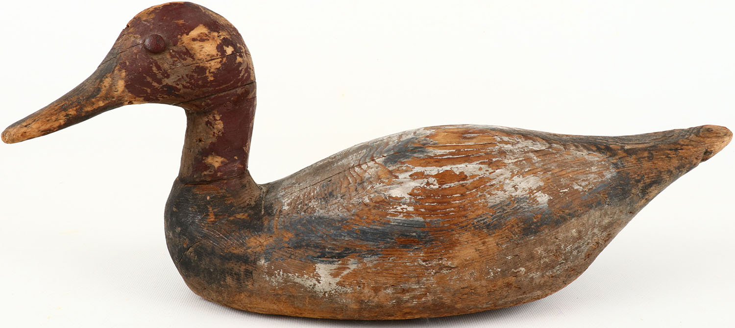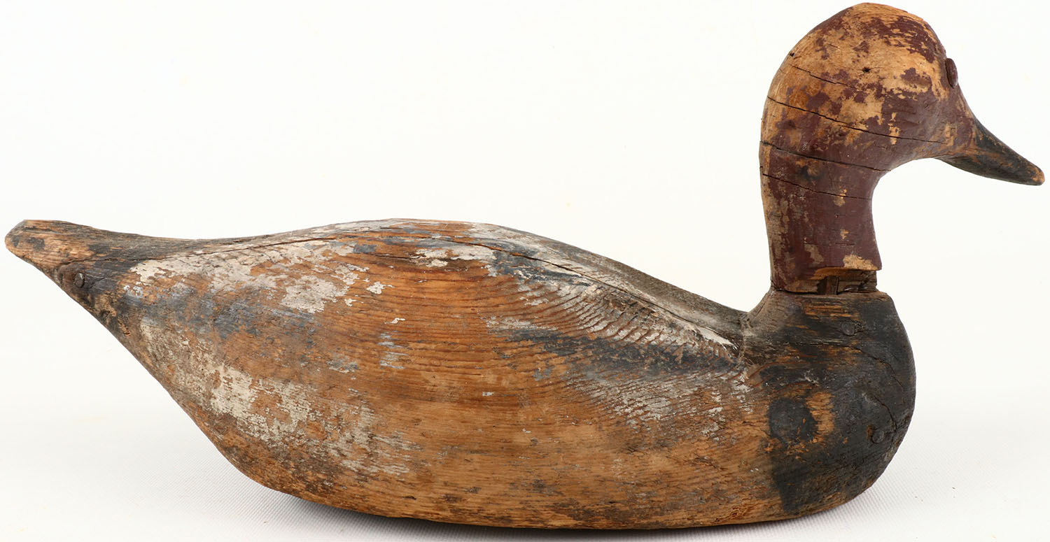High neck Canvasback Drake by unknown, TE, solid wood, paint is mostly worn off, crack to head. Grade: Good ++ - Value: 30 to 50