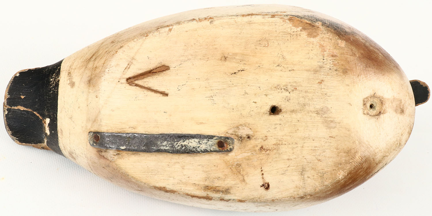 Goldeneye Drake by unknown, GE, solid wood, original paint shows wear, large chip repair to tail & age crack to back, head is loose on dowel. Grade: Very Good - Value: 50 to 150