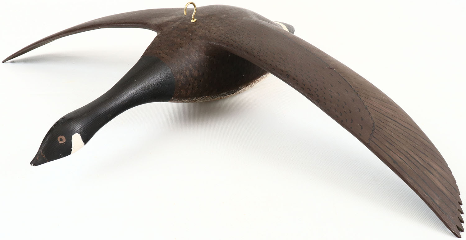 Flying Brant by Bob Pike, Oak Harbor WA., painted eyes, structurally excellent, hollow wood, mint original paint with feather detail 16'' IN OAL, very minor chips on wings. Grade: Excellent ++ - Value: 50 to 150