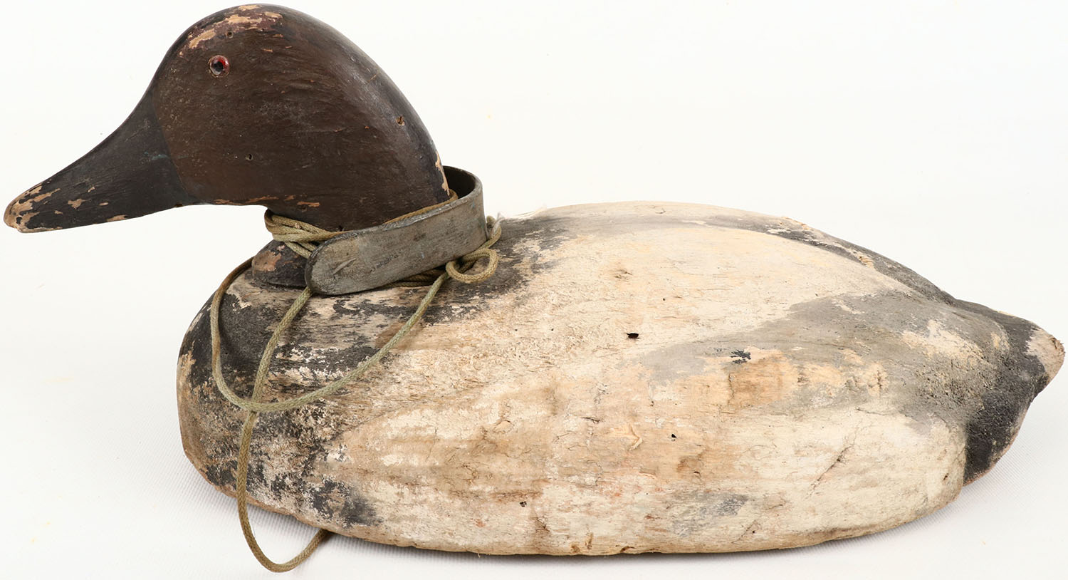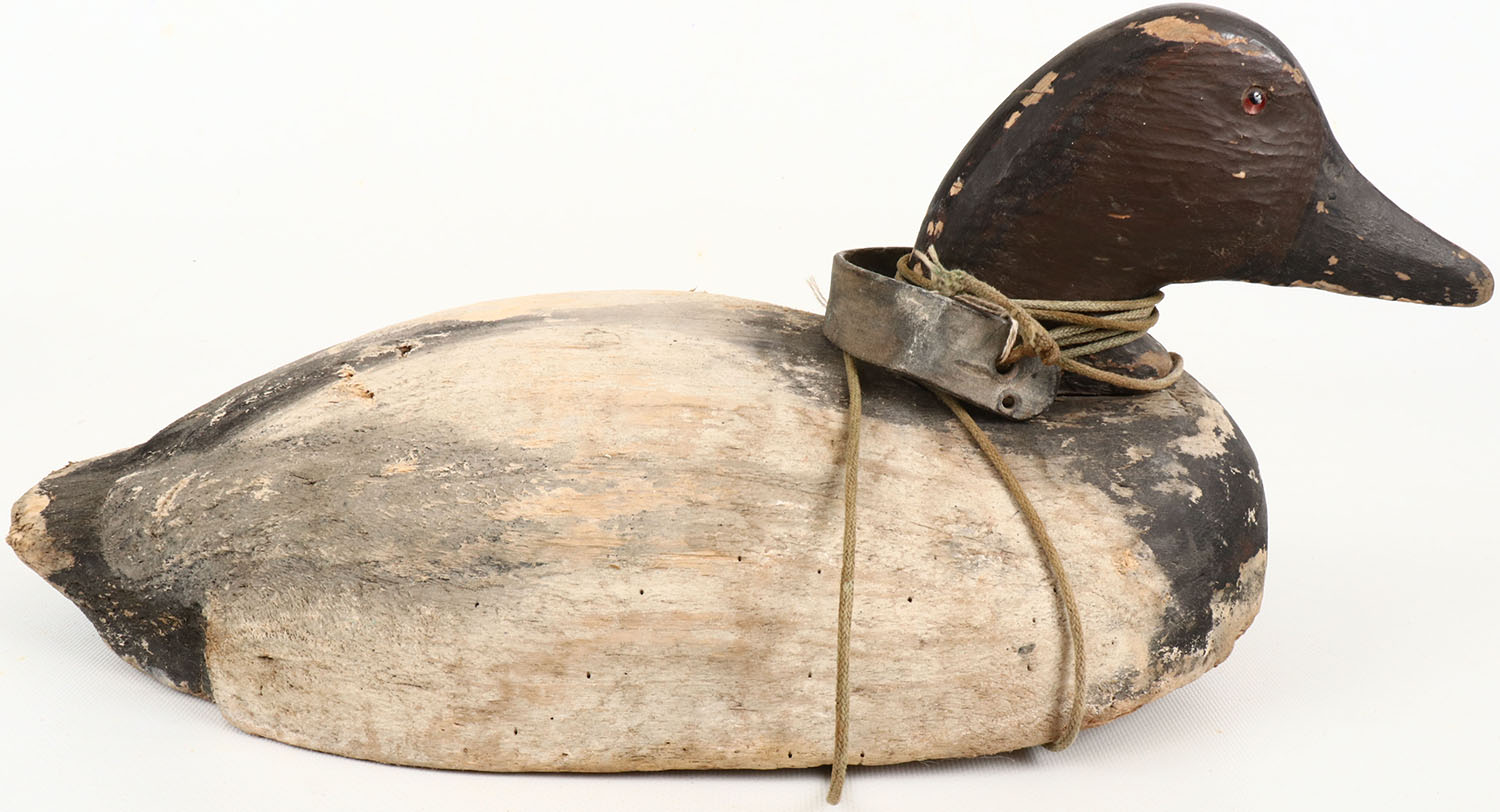 Canvasback Drake by unknown maker, glass eyes, solid balsa wood, original paint with typical wear. Grade: Very Good - Value: 30 to 60