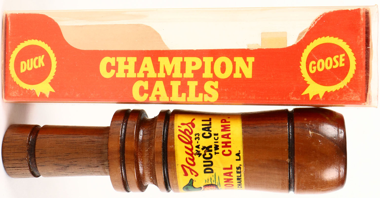 Faulk's Duck Call, Model WA-33, in original box with great label on call, International Champ twice. Grade: Excellent ++ - Value: 10 to 30
