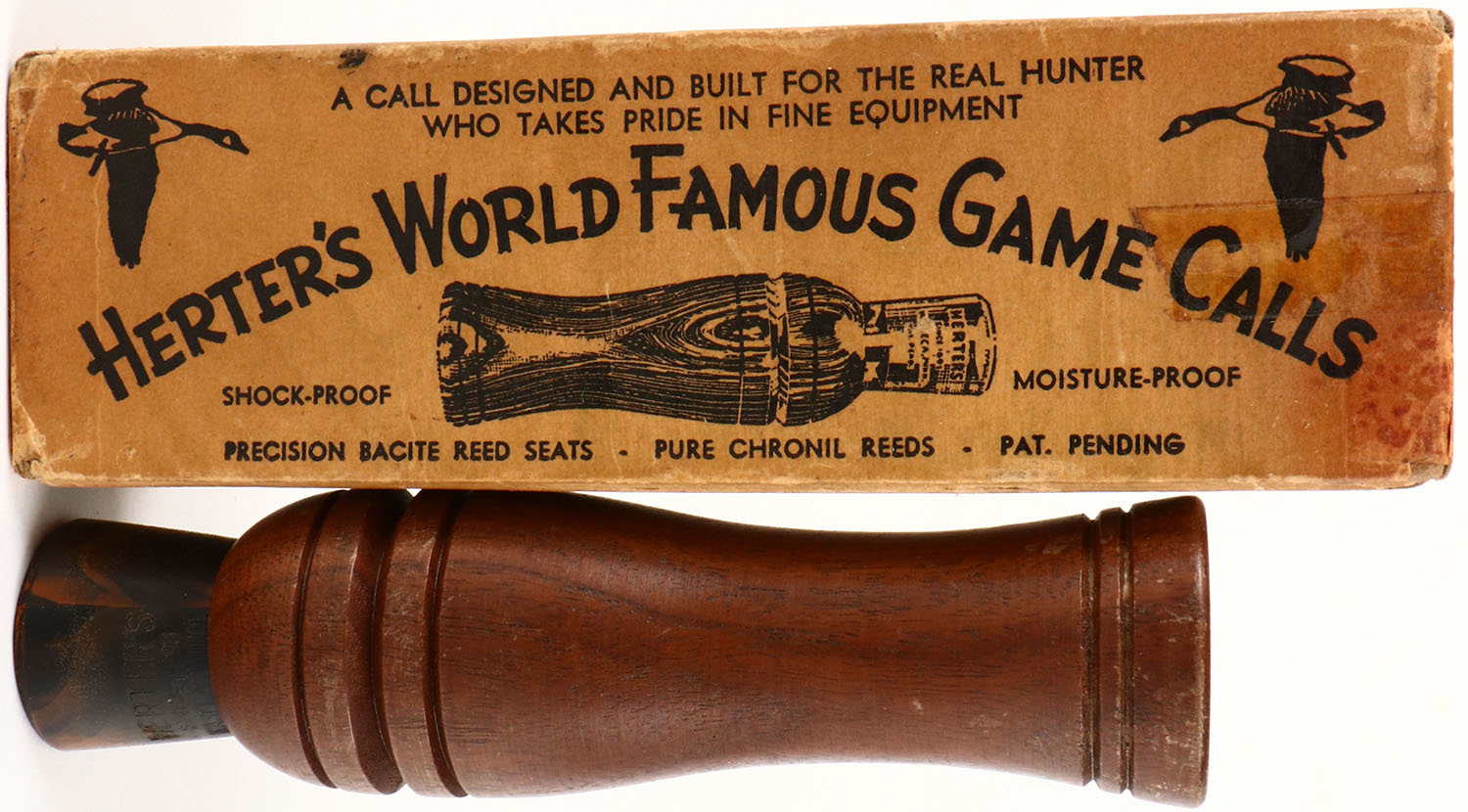 Herters Numara Goose Call. Model No. 377. Black Walnut Barrel w/Black Stopper. Has original box & paperwork, Ca. 1960s. Grade: Excellent - Value: 10 to 50