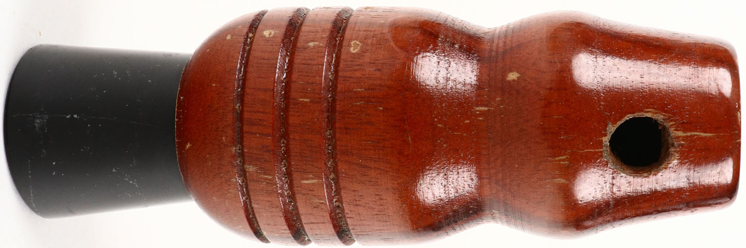 Herters Saskatchewan Goose Call. Hard to Find Early Model No. C155. Tiger Wood Barrel w/Black Stopper. Call Only, Lodermeier Collection. Grade: Excellent + - Value: 20 to 60