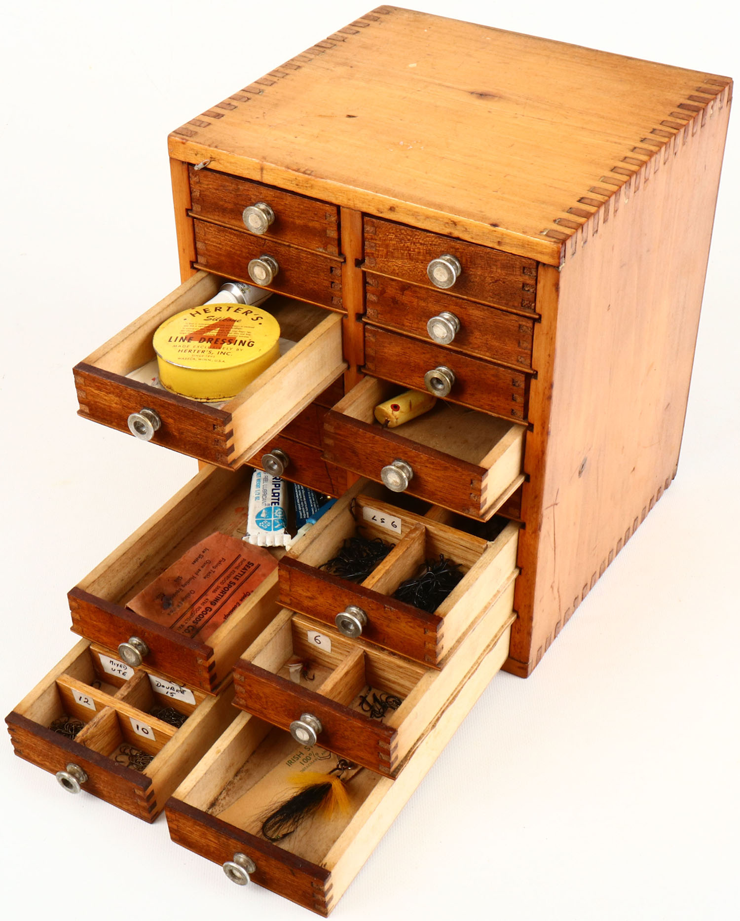 English Fly Tier's pine drawer set, full of many flies & hooks, 9'' x 8 1/2'' x 11''. Grade: Excellent - Value: 70 to 300