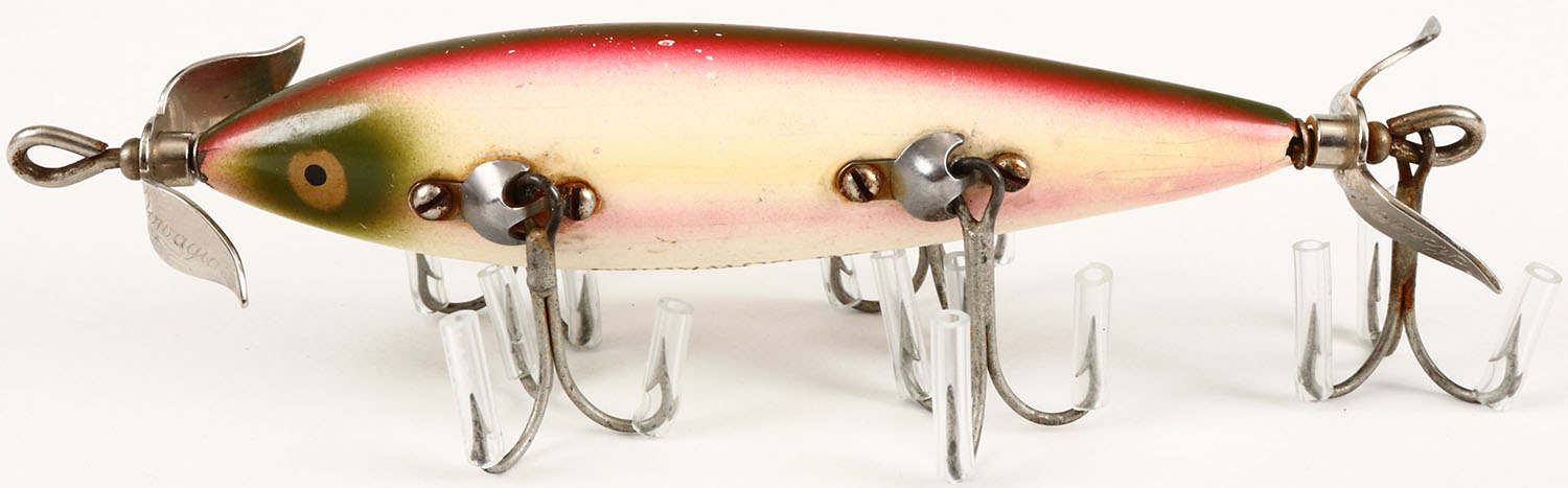 Heddon 150 Dowagiac 5 hook fishing lure, wood lure with PE, rainbow finish back with pick stripe, lure ins near mint. Grade: Excellent ++ - Value: 50 to 250
