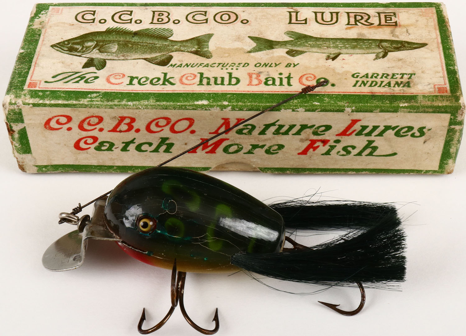 Creek Chub Ding Bat lure in the original box, GE, frog pattern, metal lip, 2 hook lure, shows light creasing with touch ups around eyes. Grade: Excellent - Value: 20 to 60
