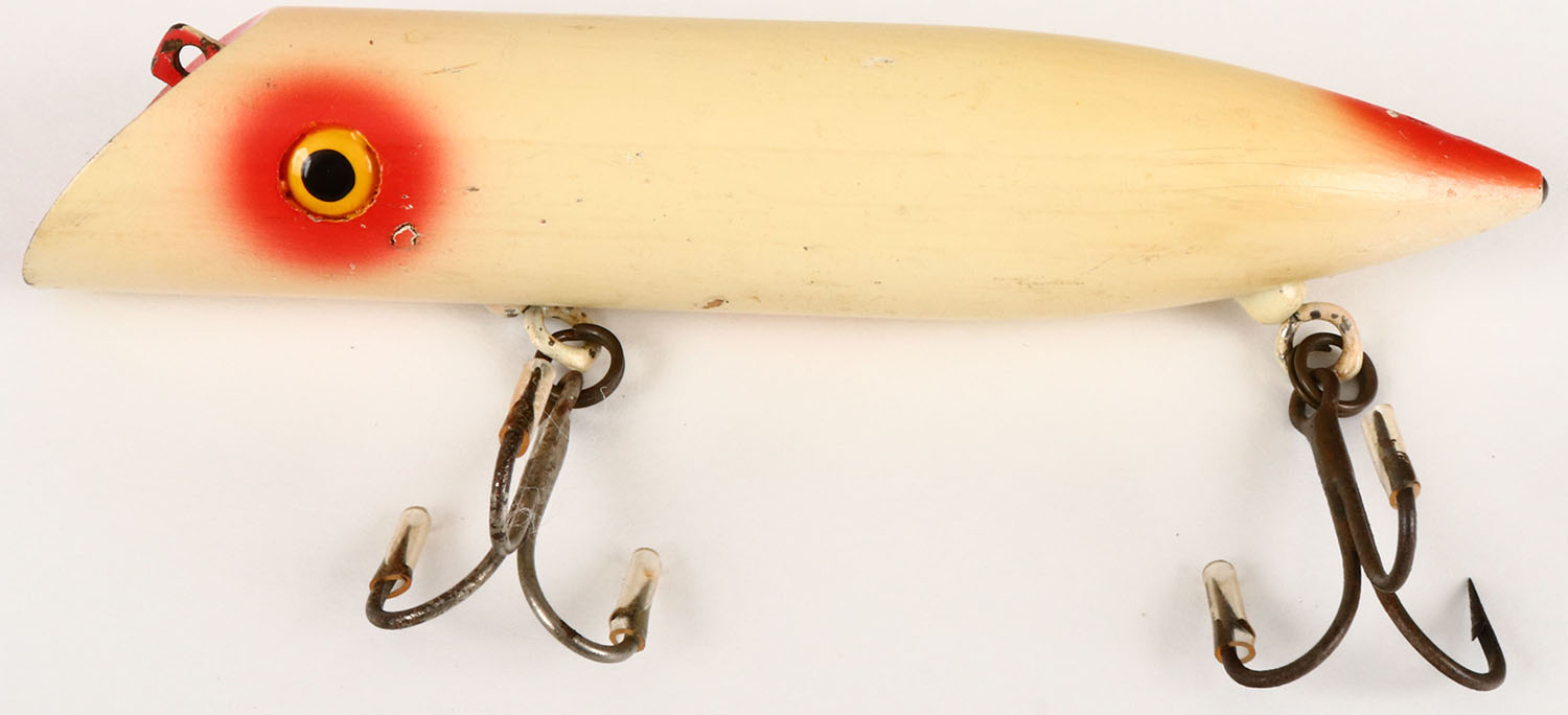 Arlington Salmon Plug, GE, well marked, white with red lip. Grade: Excellent - Value: 10 to 30