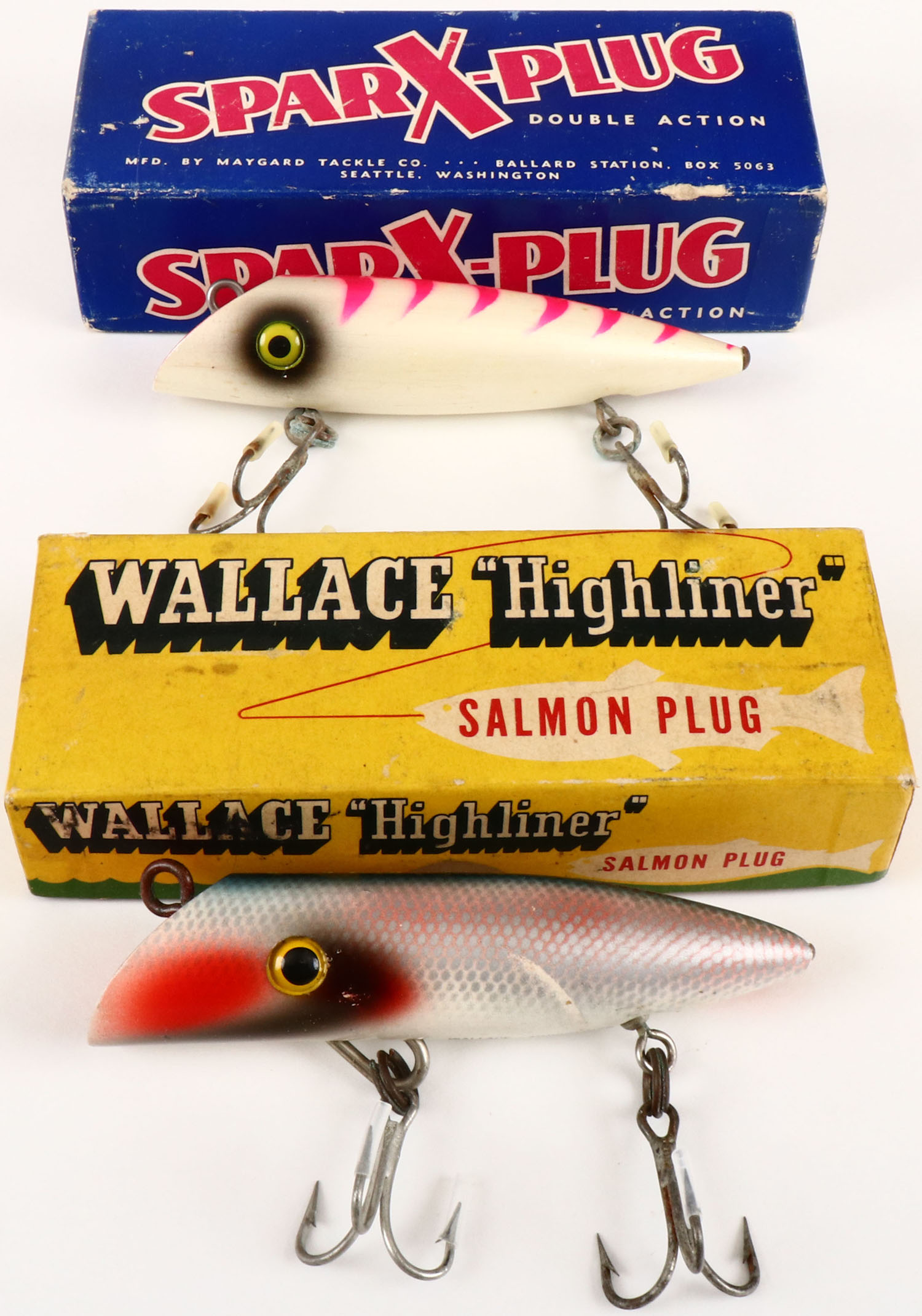 Lot of 2 SparX/Wallace Highliner Salmon plugs in original boxes. Grade: Excellent - Value: 10 to 60