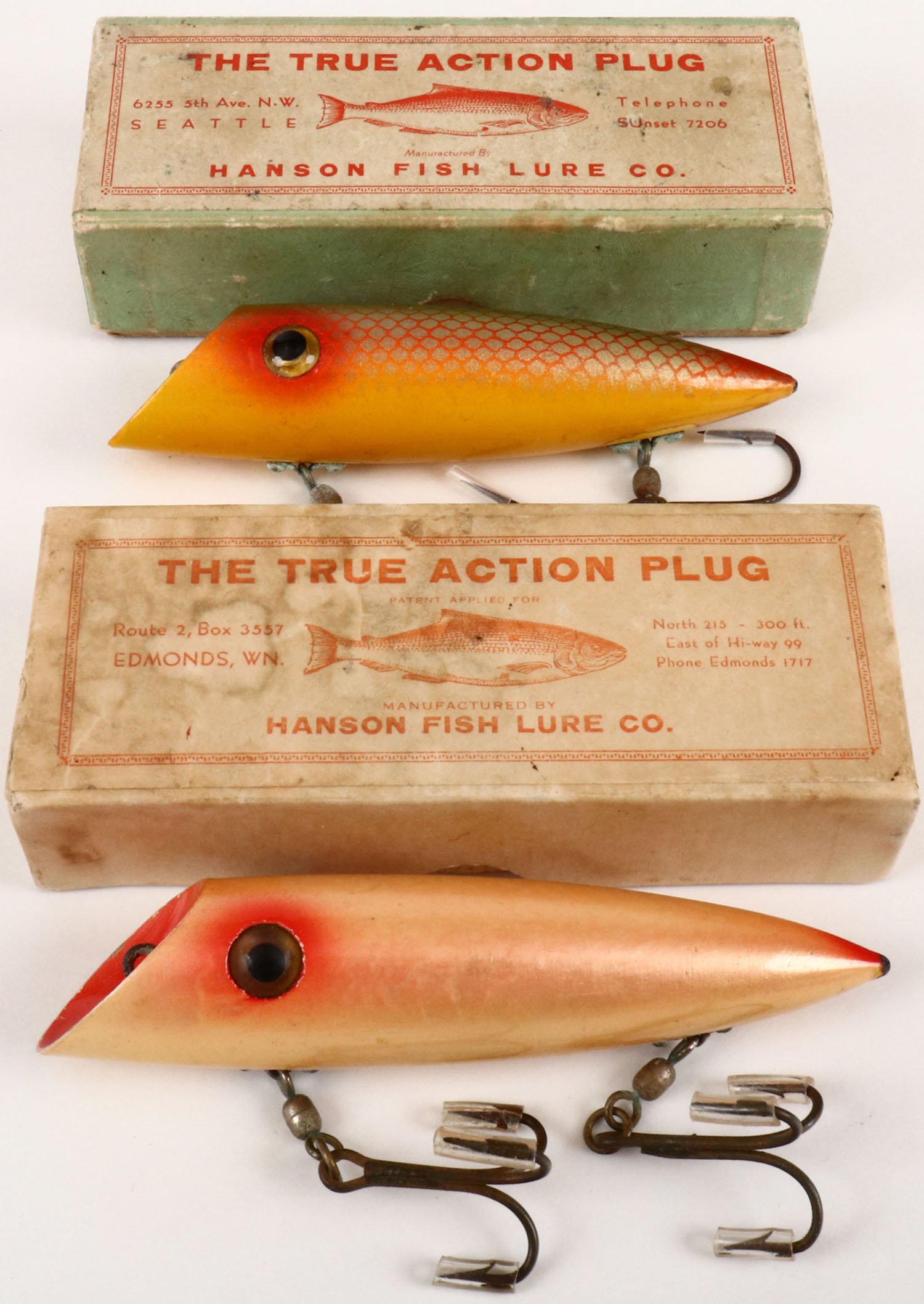 Lot of 2 Hanson Salmon plugs in original boxes. Grade: Very Good ++ - Value: 10 to 60