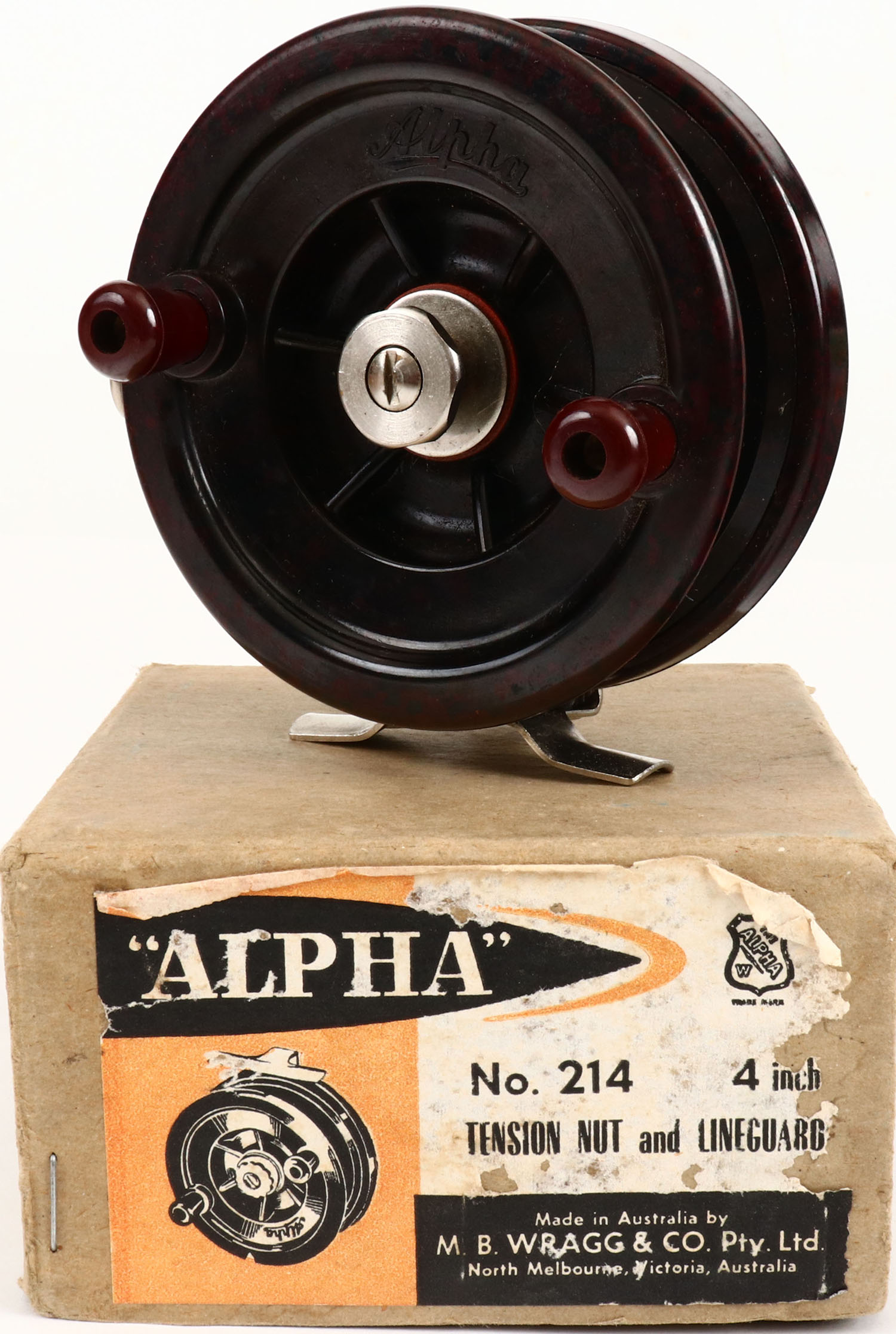 M.B. Wraggs & Co. ALPHA No. 214 Fly Reel, made in Australia, 4'', has original box. Grade: Excellent ++ - Value: 20 to 60