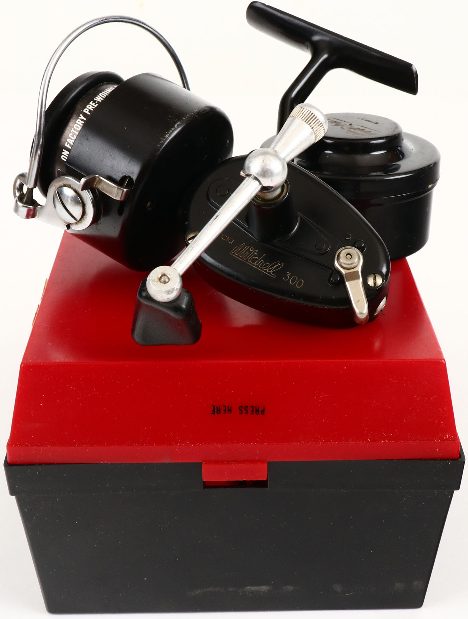 RARE Mitchell Garcia 300 spinning reel in original box with spare spool & never used as it has the paper adv. on spool. Grade: MINT - Value: 20 to 60