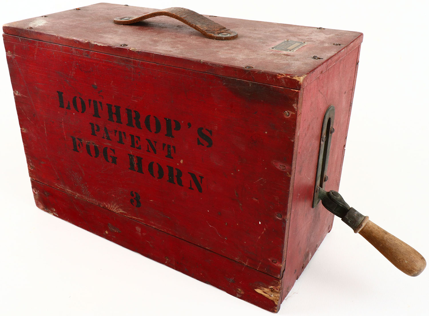 An authentic L.D. Lothrop boxed fog horn, SN: 22572. Pat. Aug. 20, 1901 as engraved on the makers brass tag. Crank handle on box side and retaining its original red painted wood box and black stenciled letters on both sides. It appears the internal bellows are still working as it makes a sound. Measures 20 1/2 in. X 9.5 in X 16 1/2 in.. This fog horn was manufactured by the L.D.Lothrop Co., in Gloucester, Mass. The fog horn was invented by Llewellyn Day Lothrop, born in Appleton, Maine in March of 1836. In 1880 Mr. Lothrop started a general ship chandlers business in Gloucester. He invented different swivels & hooks for fishing, but was best known for the famous, Lothrop PATENT Fog Horn. His business was located on Duncan Point (Harbor Loop area) on Locust St., Gloucester, Mass. Grade: Excellent - Value: 200 to 600