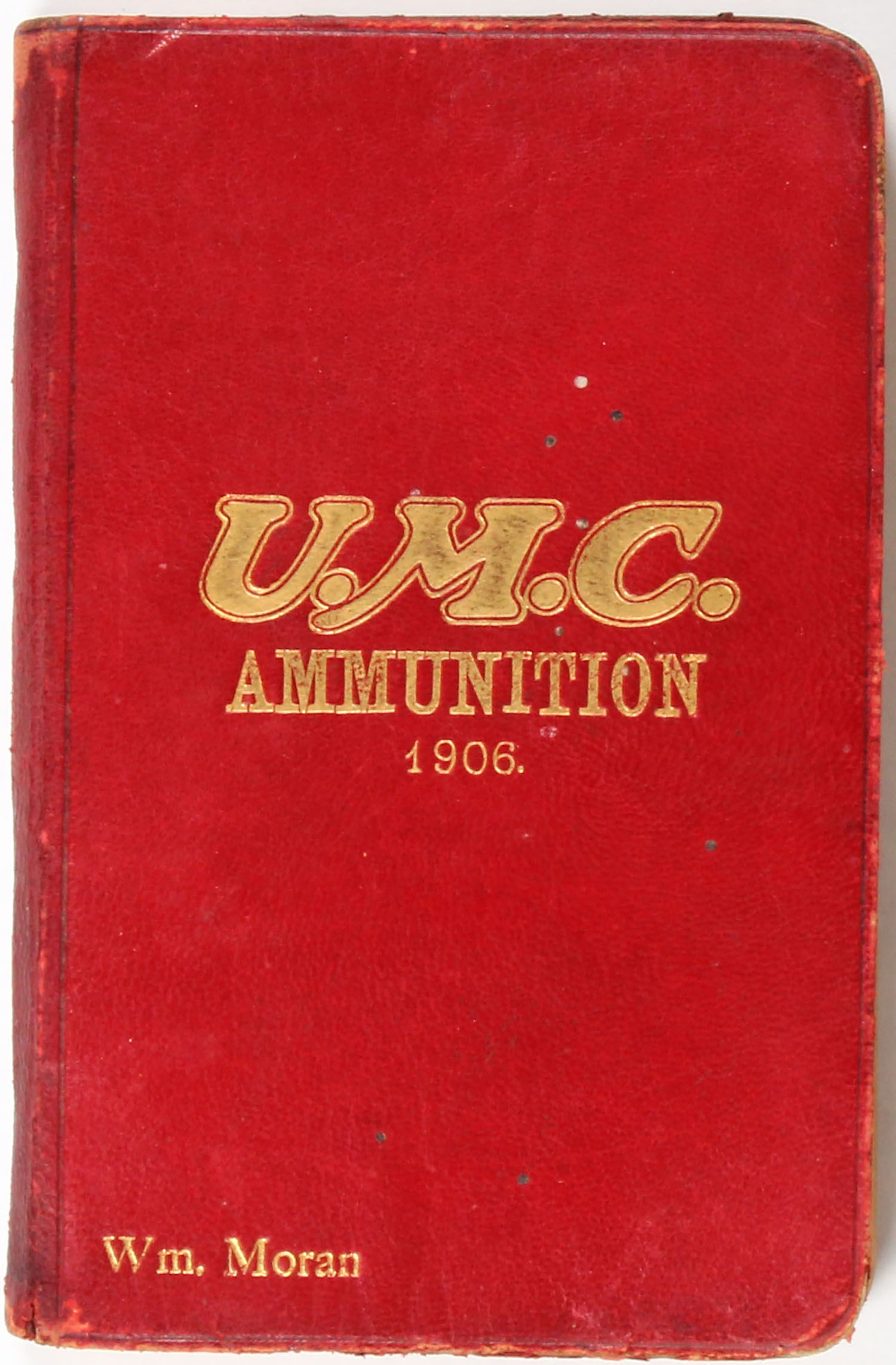 U.M.C. Ammunition, Metallic Cartridges, Empty and Loaded Paper Shells, Primers, Gun Wads. 1906 Wm. Moran, 4 1/2'' x 7''. 86 pages, pages clean, binding tight, softcover good with some tearing and stains. Grade: Very Good ++ - Value: 10 to 200