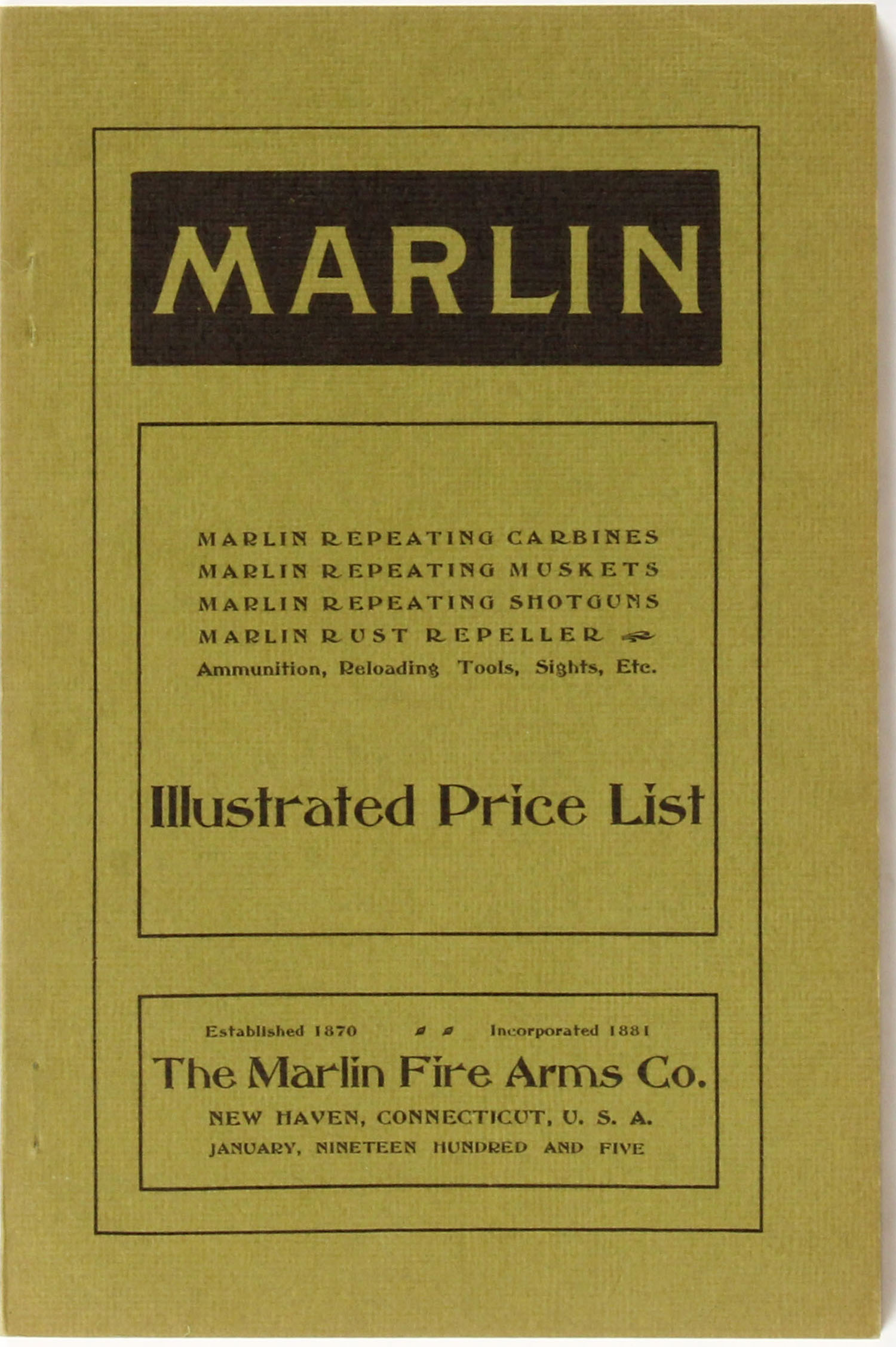 Marlin Repeating Carbines, Muskets, Shotguns, Rust Repeller, Ammunition, Reloading Tools, Sights, Etc. Illustrated Price List, 1905, 128 pages, 5 1/4'' x 8''. Pages clean, b/w images, binding tight, cover excellent. Grade: Excellent ++ - Value: 20 to 200