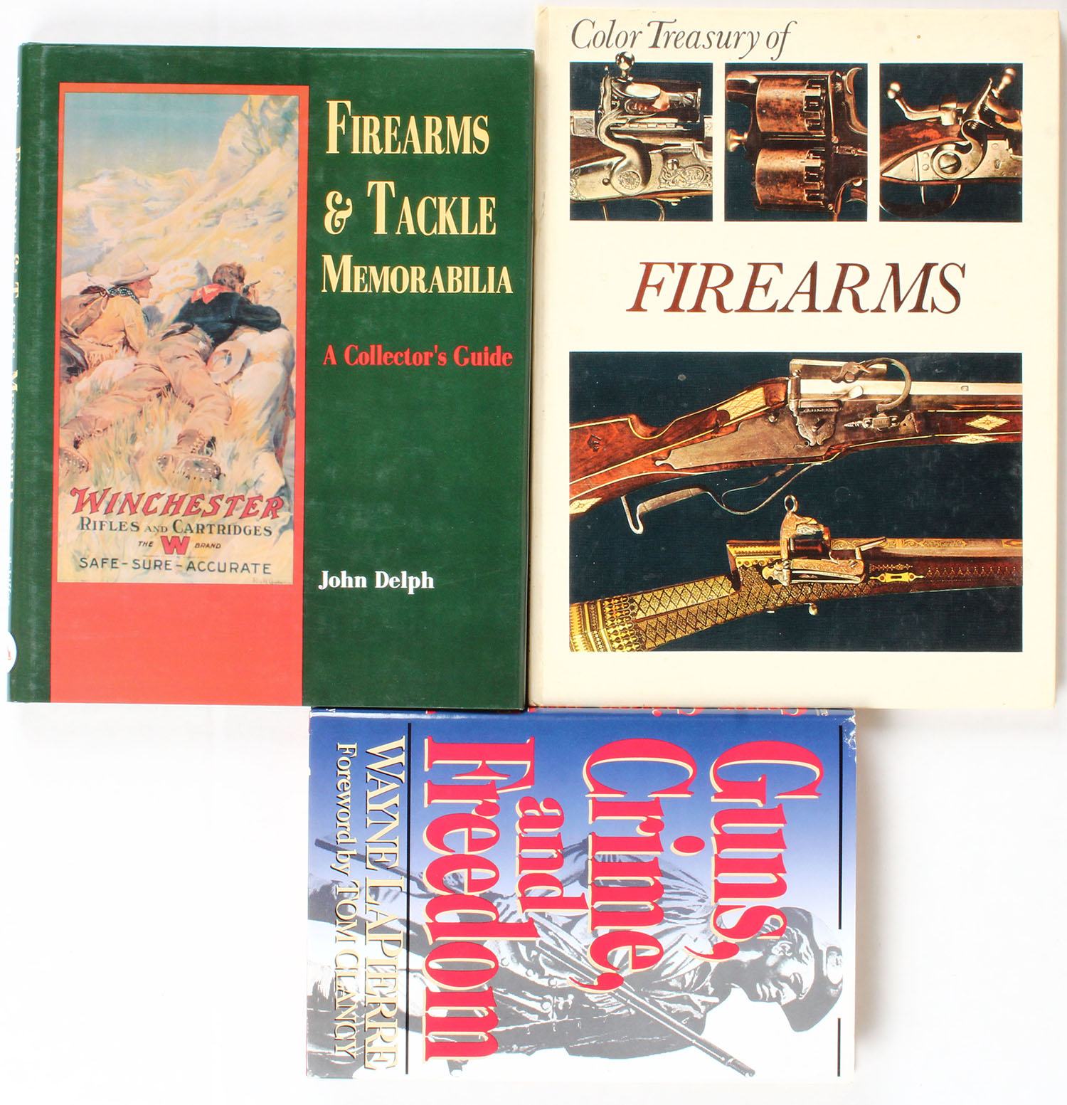 Lot of 3 (1) Guns, Crime, and Freedom by Wayne Lapierre. (1) Firearms & Tackle Memorabilia A Collector's Guide by John Delph. (1) Color Treasury of Firearms. All hardcover and dustjackets very good, pages clean, bindings tight. Grade: Very Good ++ - Value: 2 to 50