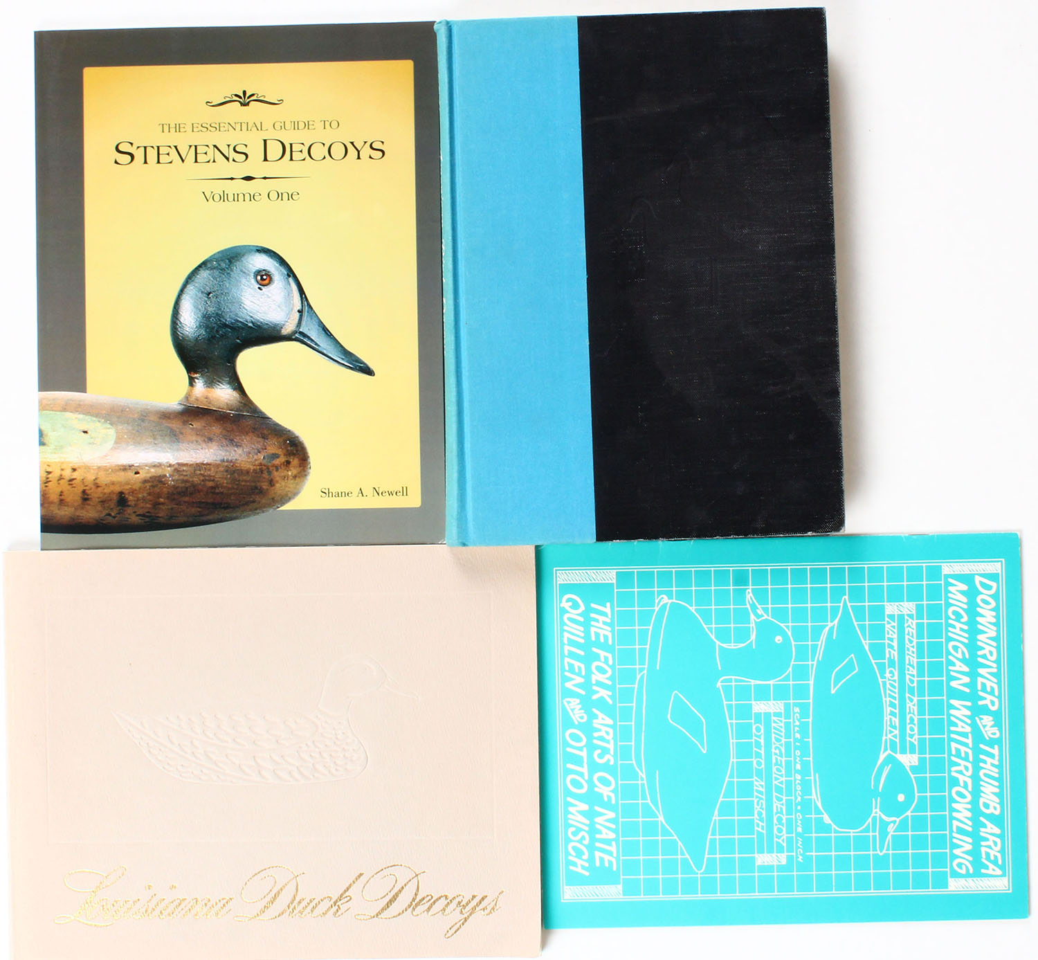 Lot of 4 Decoy Books (1) The Essential Guide To Stevens Decoys Volume One by Shane A. Newell (1) Louisiana Duck Decoys by Charles W. Frank, Jr. (1) Downriver and Thumb Area Michigan Waterfowling by C. Kurt Dewhurst and Marsha MacDowell (1) American Bird Decoys by William J. Mackey, Jr. 1965. Grade: Very Good + - Value: 6 to 60