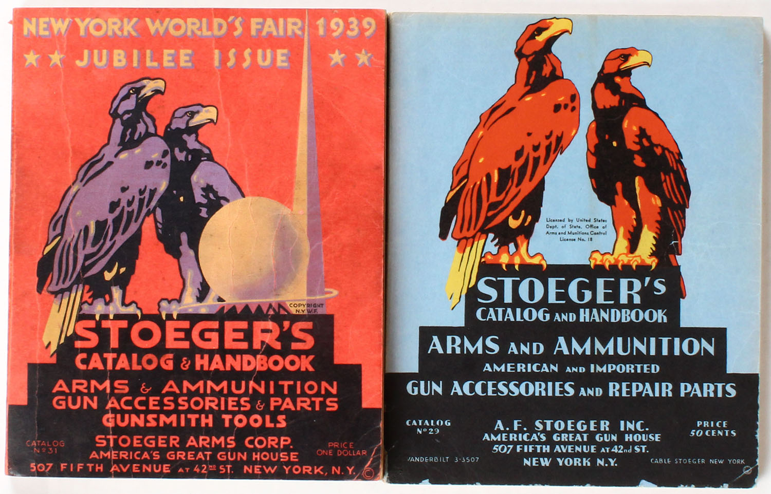 Lot of 2 (1) Stoeger' s Catalog and Handbook Catalog No. 29 1937, 8 1/2'' x 10''. 320 pages, pages clean, binding tight, softcover very good. (1) New York World's Fair Jubilee Issue 1939 Stoeger' s Catalog & Handbook No. 31, 8 1/2'' x 10''. 512 pages, pages clean, binding tight, softcover good. Grade: Very Good ++ - Value: 50 to 200