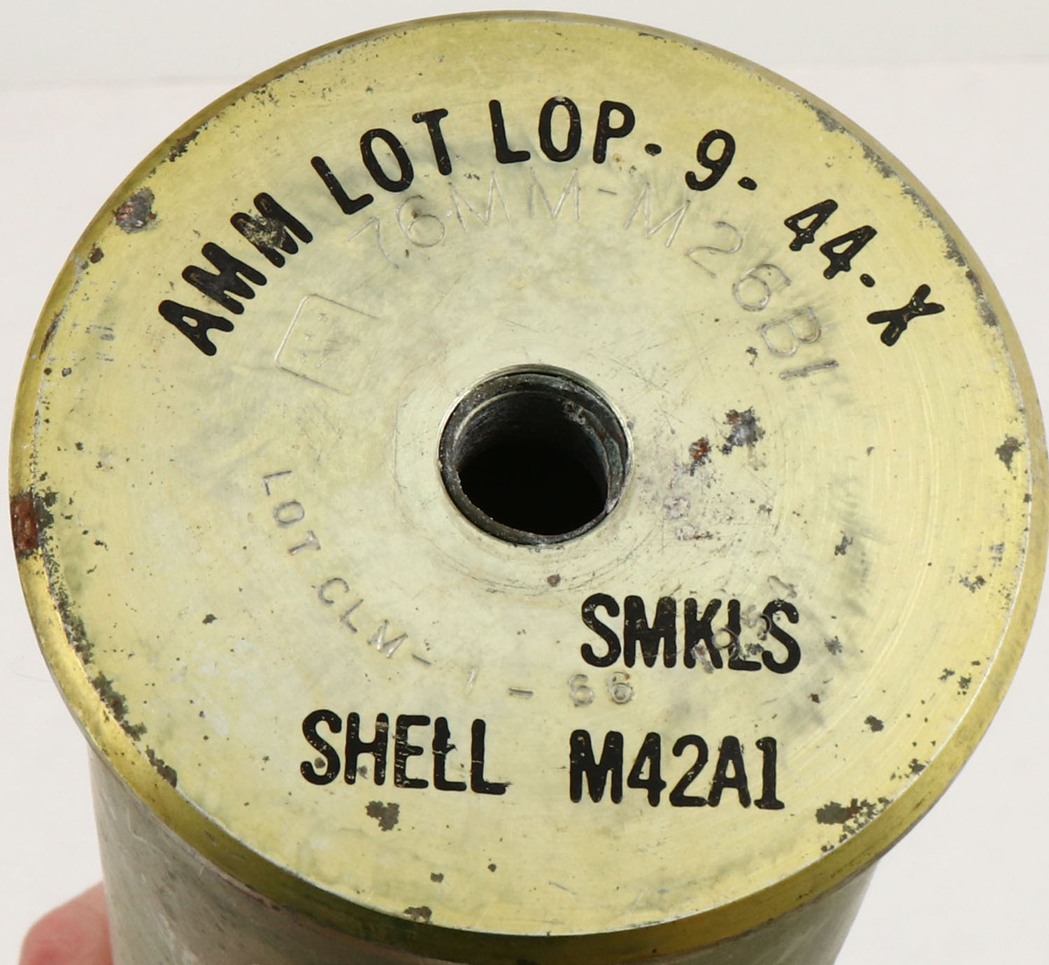 US, 76mm, Military shell, H/S ''76MM M26BI'', ''LOT CLM-1-66 1954'', ''AMM LOT LOP-9-44-X'', ''SMKLS'', ''SHELL M42A1'', OAL- 21 1/4''. Grade: Very Good + - Value: 10 to 100