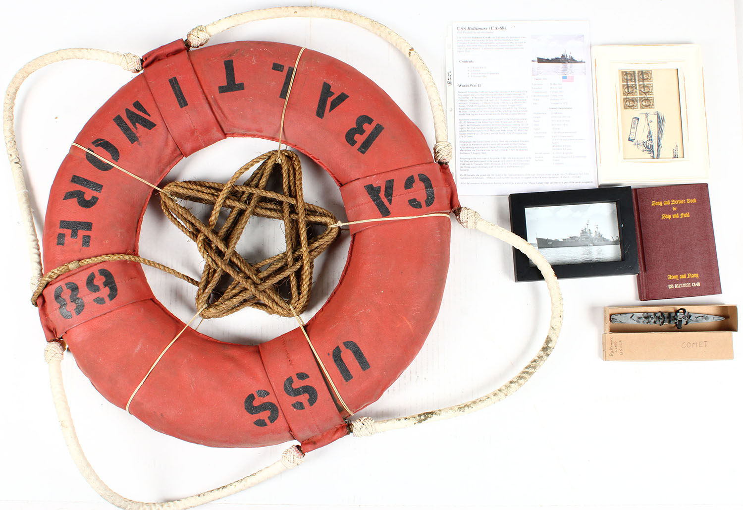 US Baltimore, Life preserver ring, This life ring came off The USS Baltimore and is a rare piece, come with documentation. Grade: Excellent - Value: 200 to 400