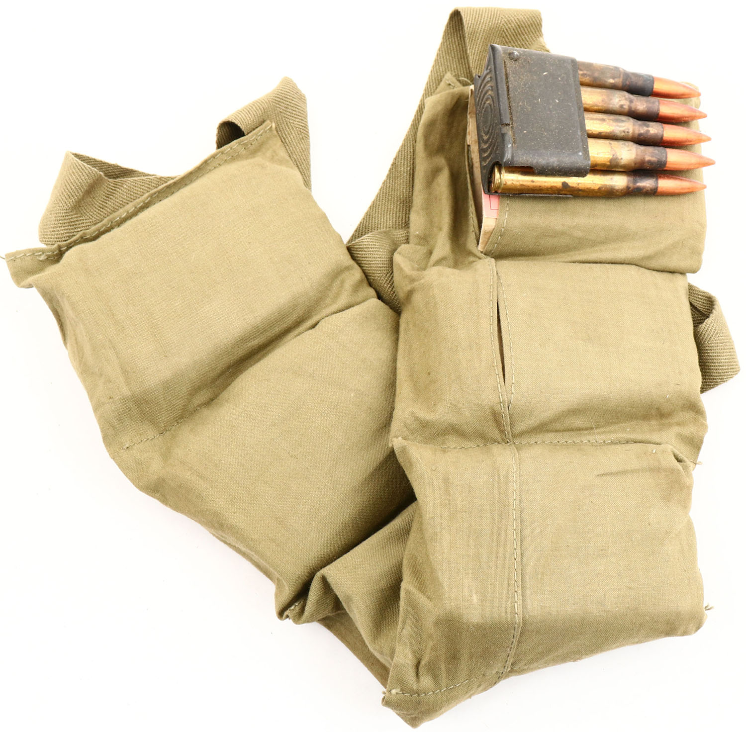 Military ammo bandoleer, 6 pouches full with 8 round clips of 30-06 in cardboard sleeves, No markings. Grade: Excellent - Value: 20 to 60