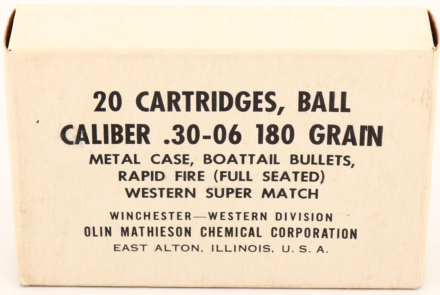 Winchester-Western, .30-06 Ball, 180 Gr. Metal cased, Boat tail Bullets, 1pc, Full, white box with black print, box is solid with light age soiling, ammo is Excellent. Grade: Excellent - Value: 20 to 40
